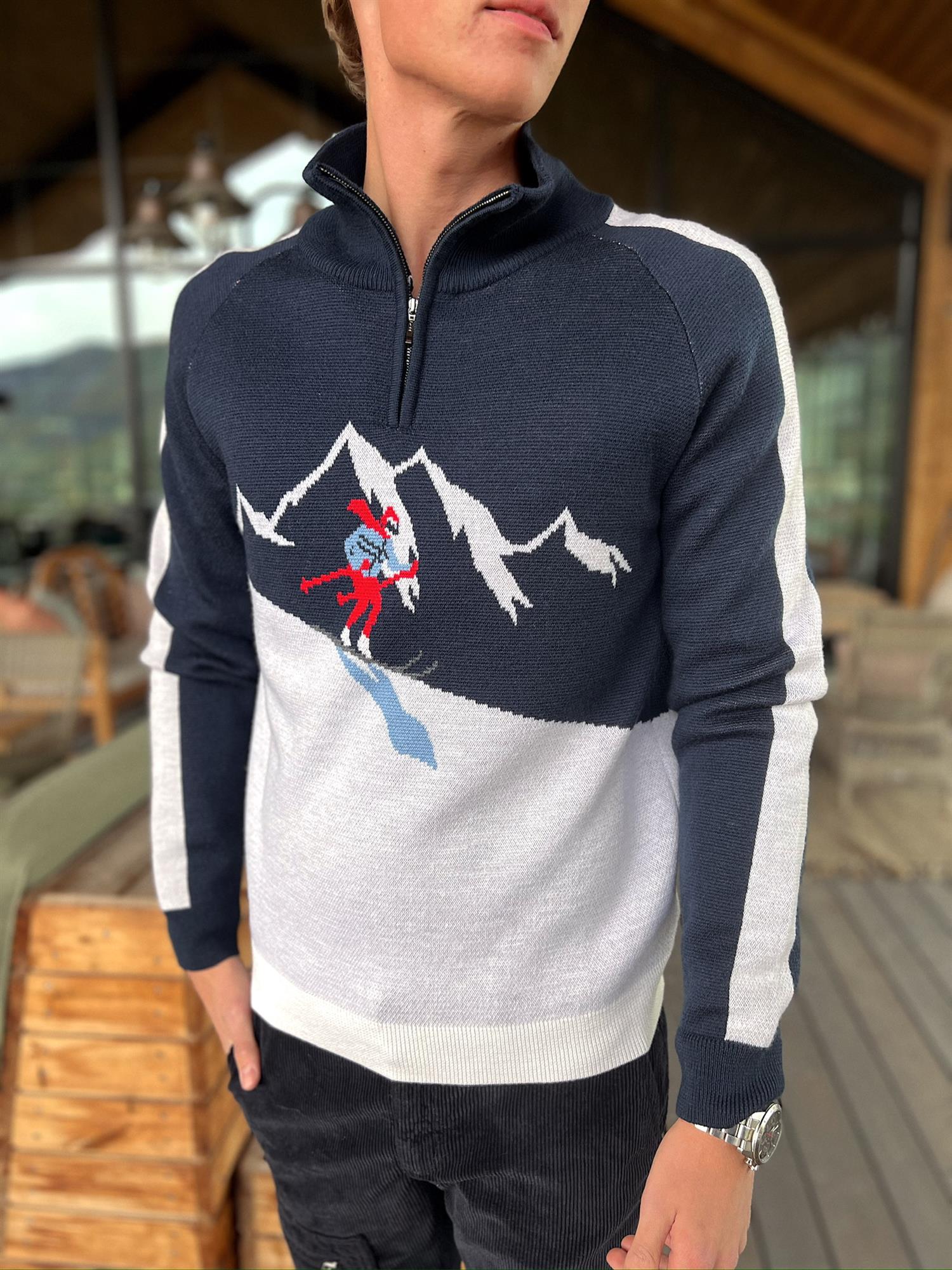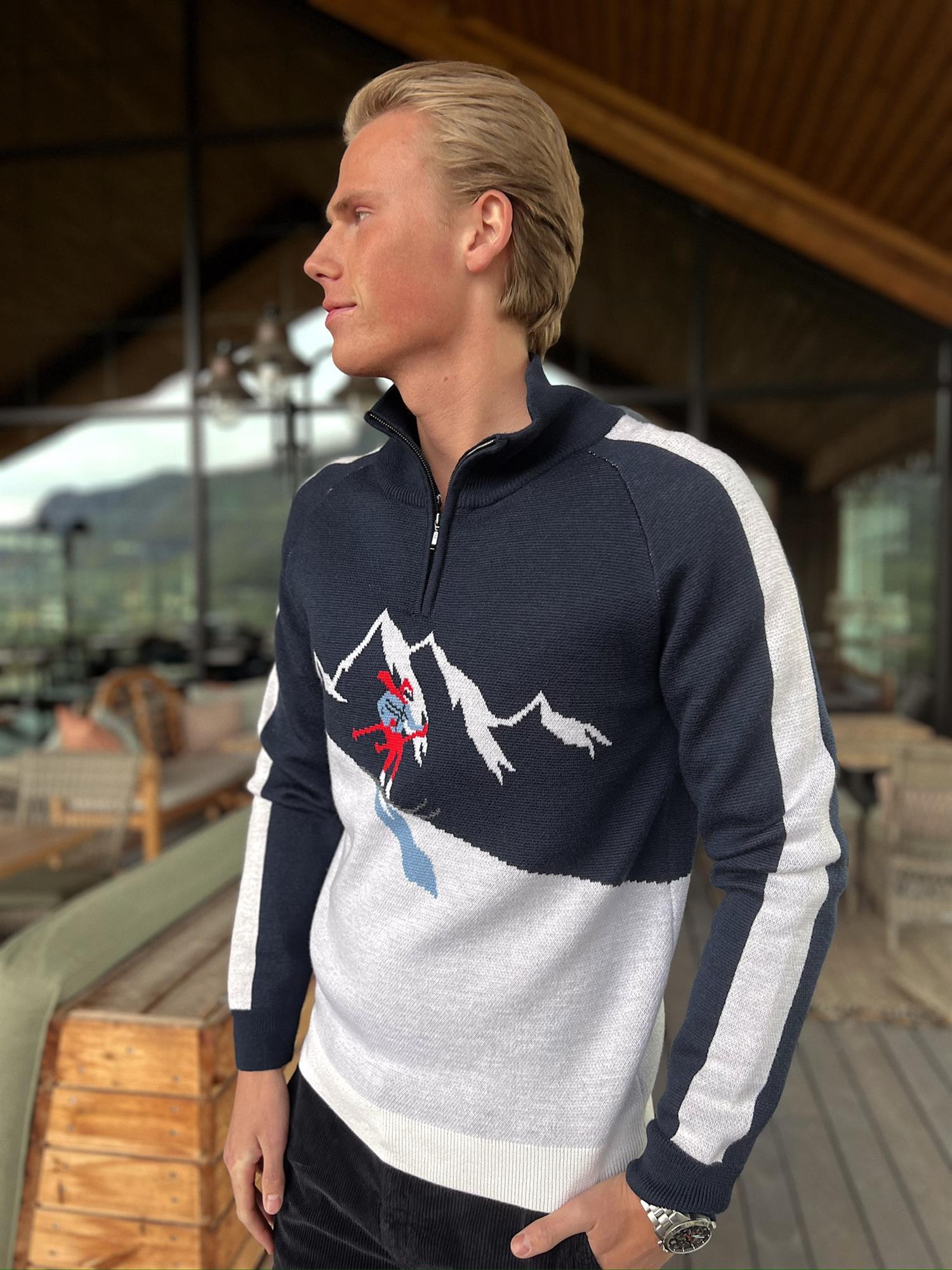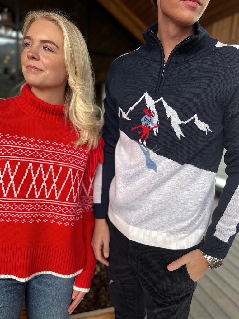 AfterSki Sweater fra We Norwegians er laget for både skibakken og après-ski. Strikket i vaskbar 100% merinoull, gir den naturlig pusteevne, fuktregulering og varme uten å være klumpete – like funksjonell som den er stilig.