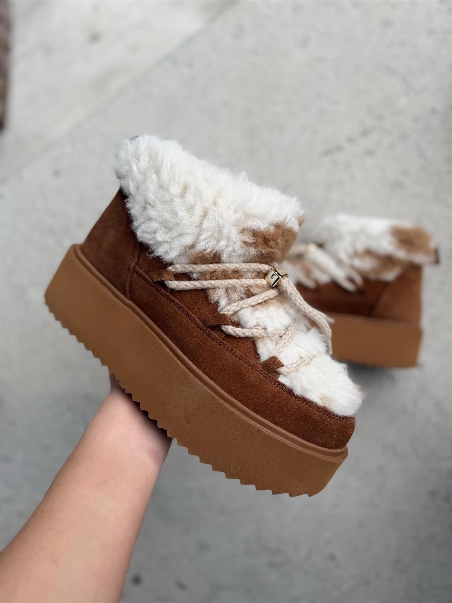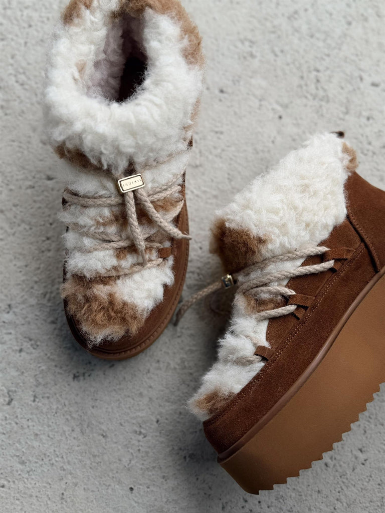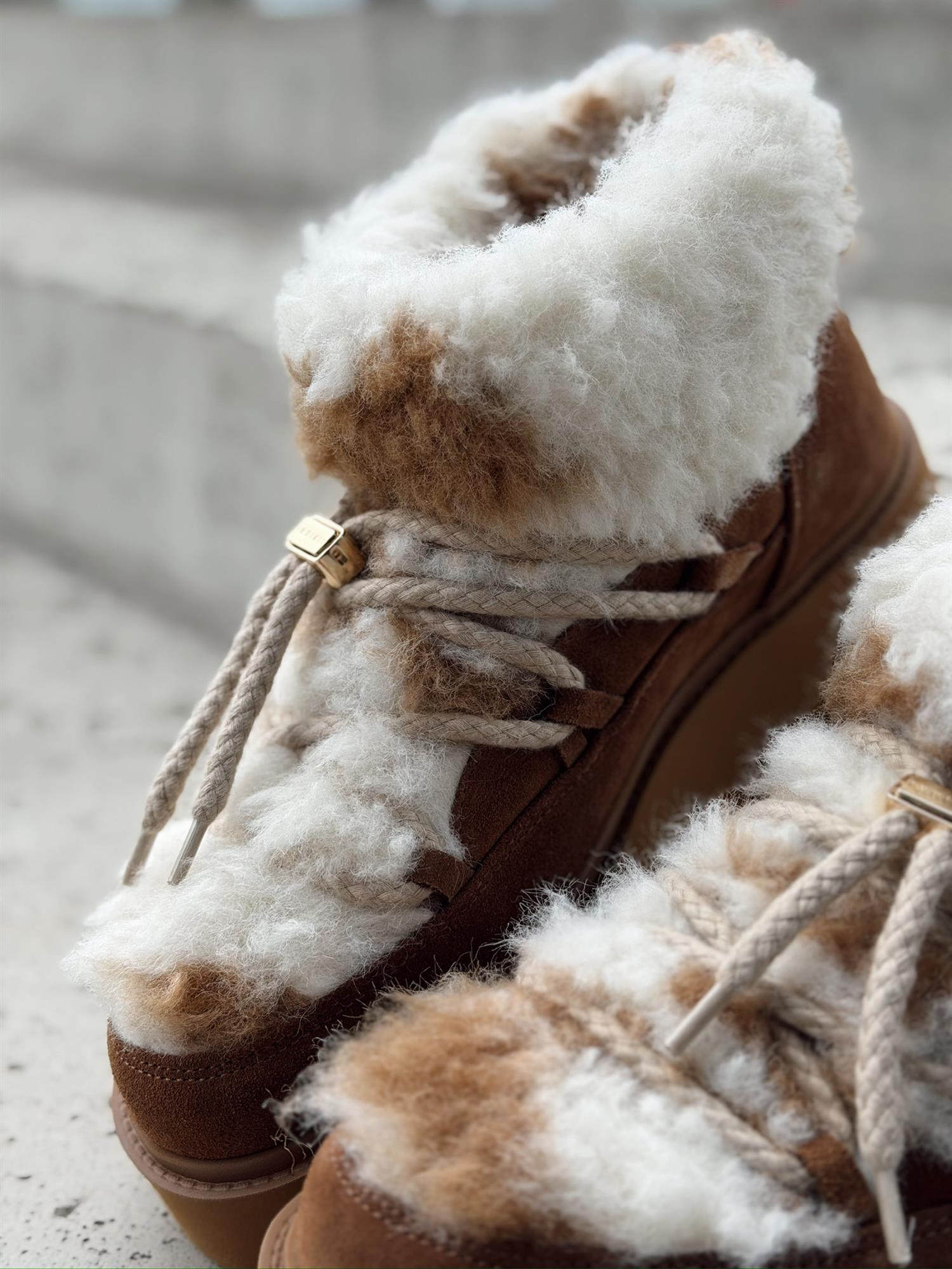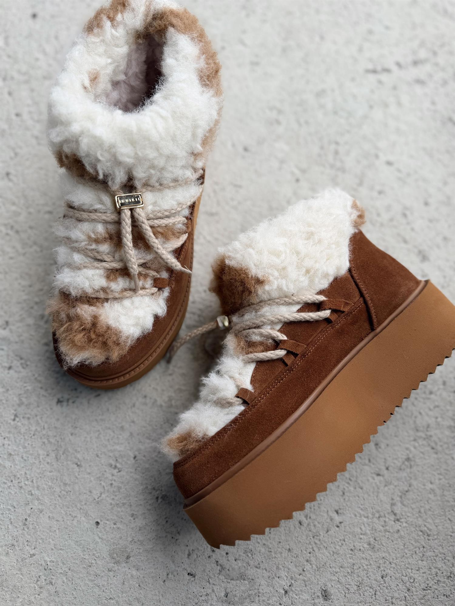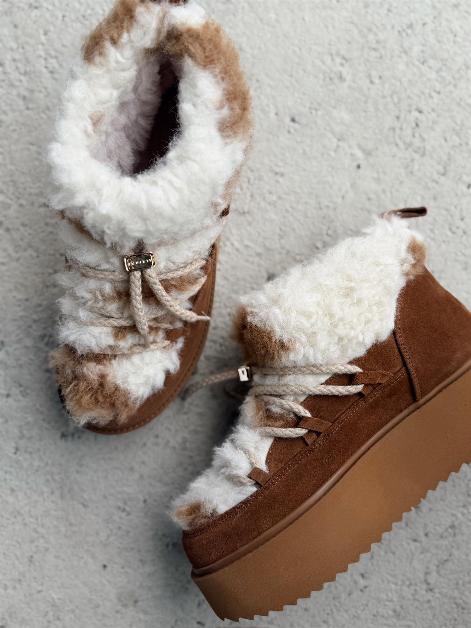 Inuikii Teddy Platform Ecru er vinterskoene som kombinerer komfort, varme og et trendy uttrykk. Den øvre delen er laget av myk fårepels og semsket skinn, som gir et eksklusivt og luksuriøst preg. Innsiden er foret med varm fårepels som holder føttene gode og lune hele vinteren.