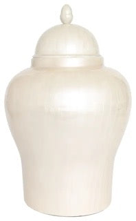 Dekorurne i emaljert metall med avtagbart lokk. Den offwhite emaljen har en lett perlemoreffekt som gir fargen en flott dybde.