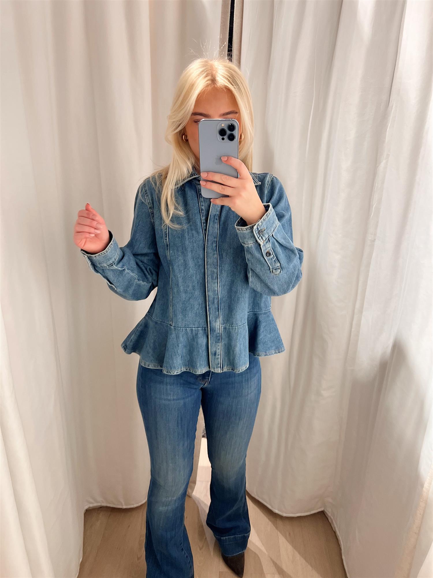 SophinaIW Shirt fra InWear er en feminin og stilfull denimskjorte med delikate volangdetaljer nederst som gir et elegant peplum-snitt. Skjorten har en klassisk krage, lange ermer og skjult knappelukking for et rent og sofistikert uttrykk. De synlige sømmene tilfører en subtil kontrast og fremhever skjortens eksklusive design.