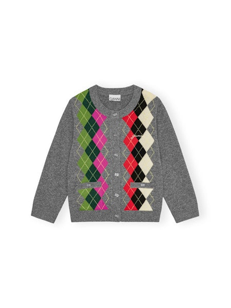 Denne cardiganen fra GANNI er et friskt pust i garderoben – preppy, men på GANNI-vis. Den er strikket i en luksuriøs miks av 70 % merinoull og 30 % cashmere, noe som gir en myk og eksklusiv følelse mot huden. Den slanke passformen og den klassiske rundhalsen gir en tidløs silhuett, mens det fargerike argyle-mønsteret i rosa, grønt, rødt og krem setter et lekent preg på det hele.