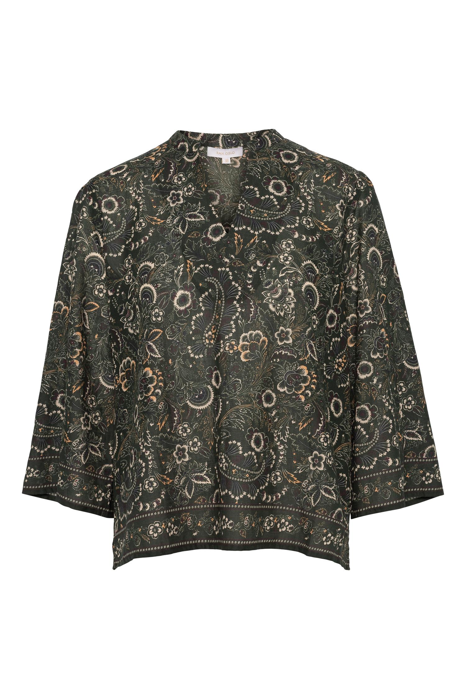 Den har en rett fasong med lange armer og v-hals utrigning. Lekre kanter nederst på blusen og nederst på armen. En favoritt som er like fin å bruke til skjørt som til en jeans.