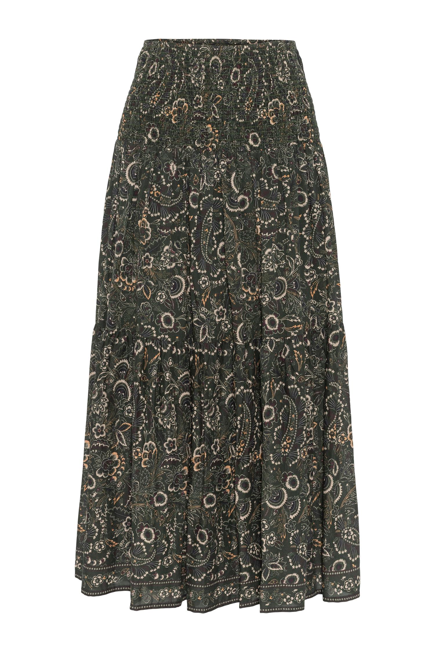 Denne lange skjørtet kombinerer komfort og eleganse på en helt nydelig måte. Den øverste delen har smock som gir en flatterende og fleksibel passform – perfekt for både hverdag og mer pyntede anledninger. Skjørtet er laget i tynn, luftig bomull som faller lett og føles behagelig mot huden. Det delikate printet gir plagget et unikt uttrykk og tilfører akkurat passe mengde farge og liv. Bruk det med en enkel topp og sandaler for et avslappet sommerantrekk, eller style det med en bluse og hæler for en mer oppkledd look.