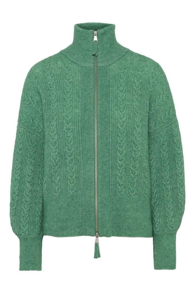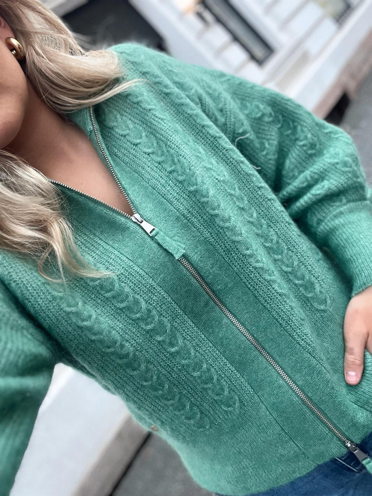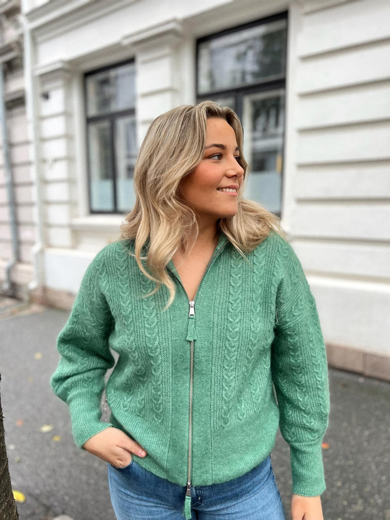 En strikket cardigan i en nydelig grønnfarge som frisker opp enhver garderobe. Den unike flettestrikken gir plagget karakter og tekstur, samtidig som den klassiske silhuetten gjør den tidløs og anvendelig.