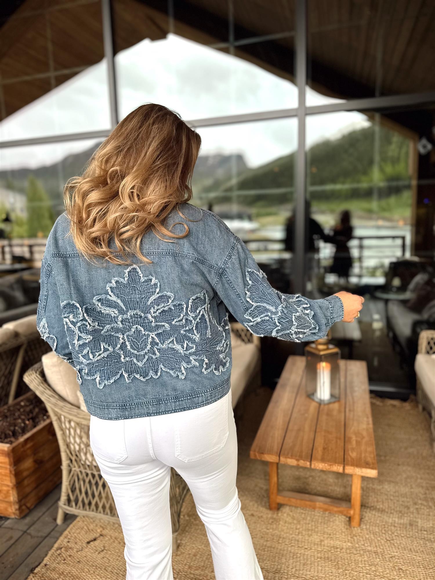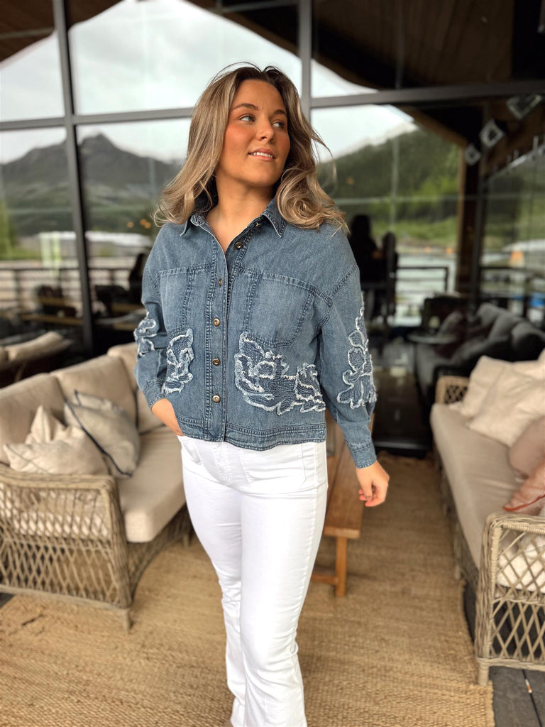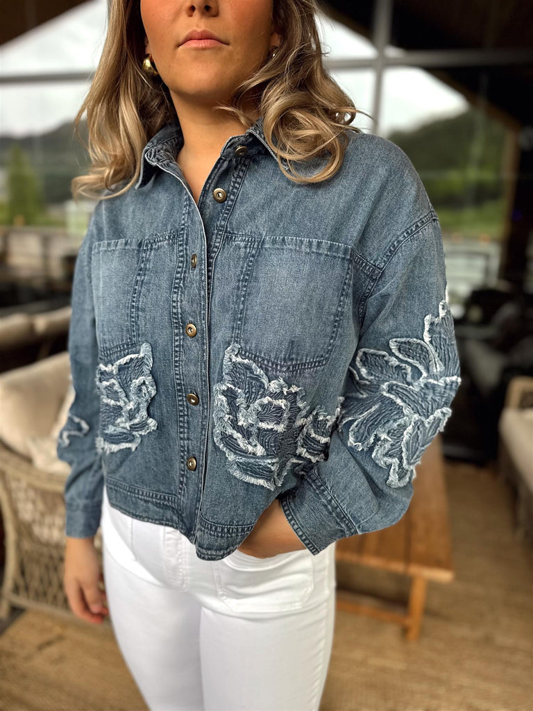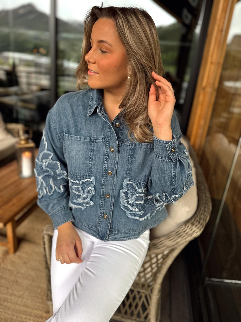 Broderte og frayed blomsterdetaljer pryder både for- og baksiden av jakken, og gir plagget et eksklusivt og kunstnerisk preg. Metallknapper i front og klassisk krage fullfører det tidløse designet.
