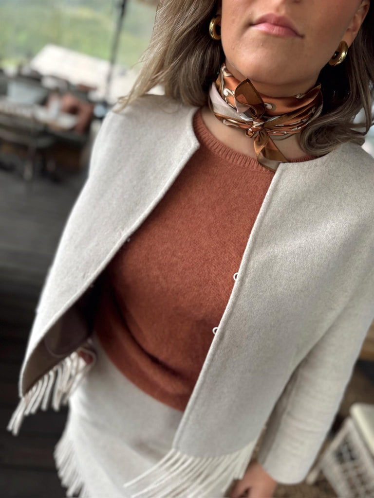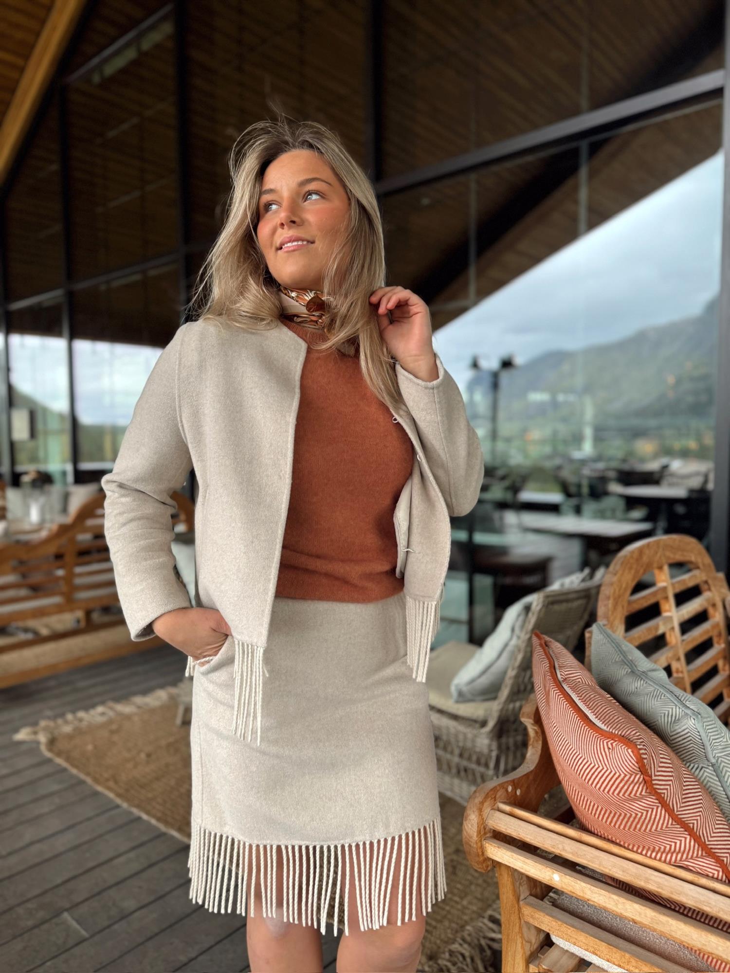 Laget av en behagelig blanding av 50% ull og 50% polyester, gir jakken både varme og komfort samtidig som den holder fasongen. Den har en noe romslig passform, så det anbefales å velge en størrelse mindre enn normalt for en mer tilpasset look. En sofistikert jakke som enkelt kan styles opp eller ned etter anledning!