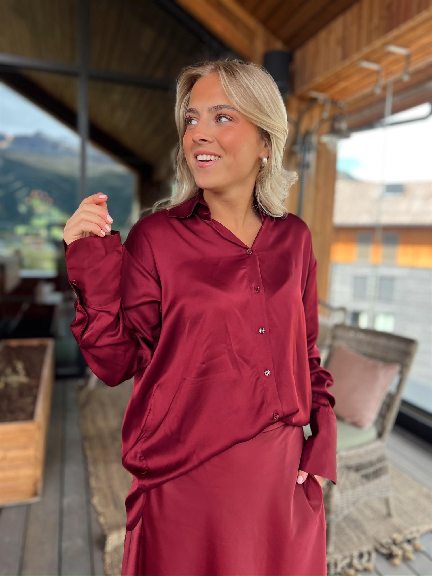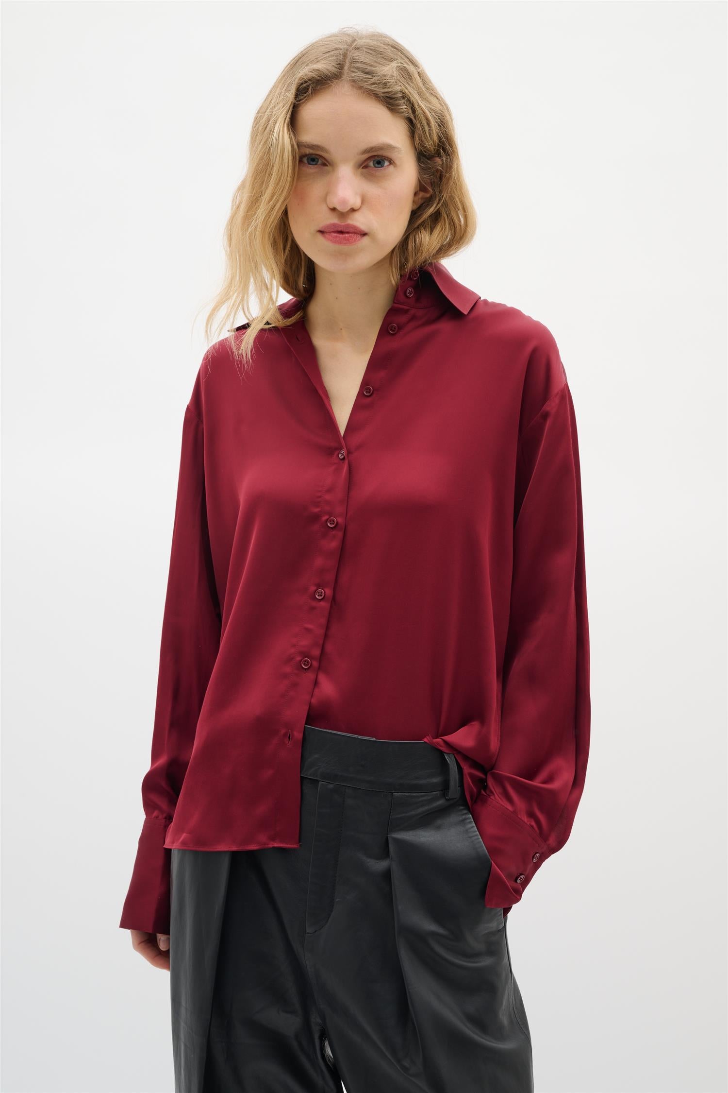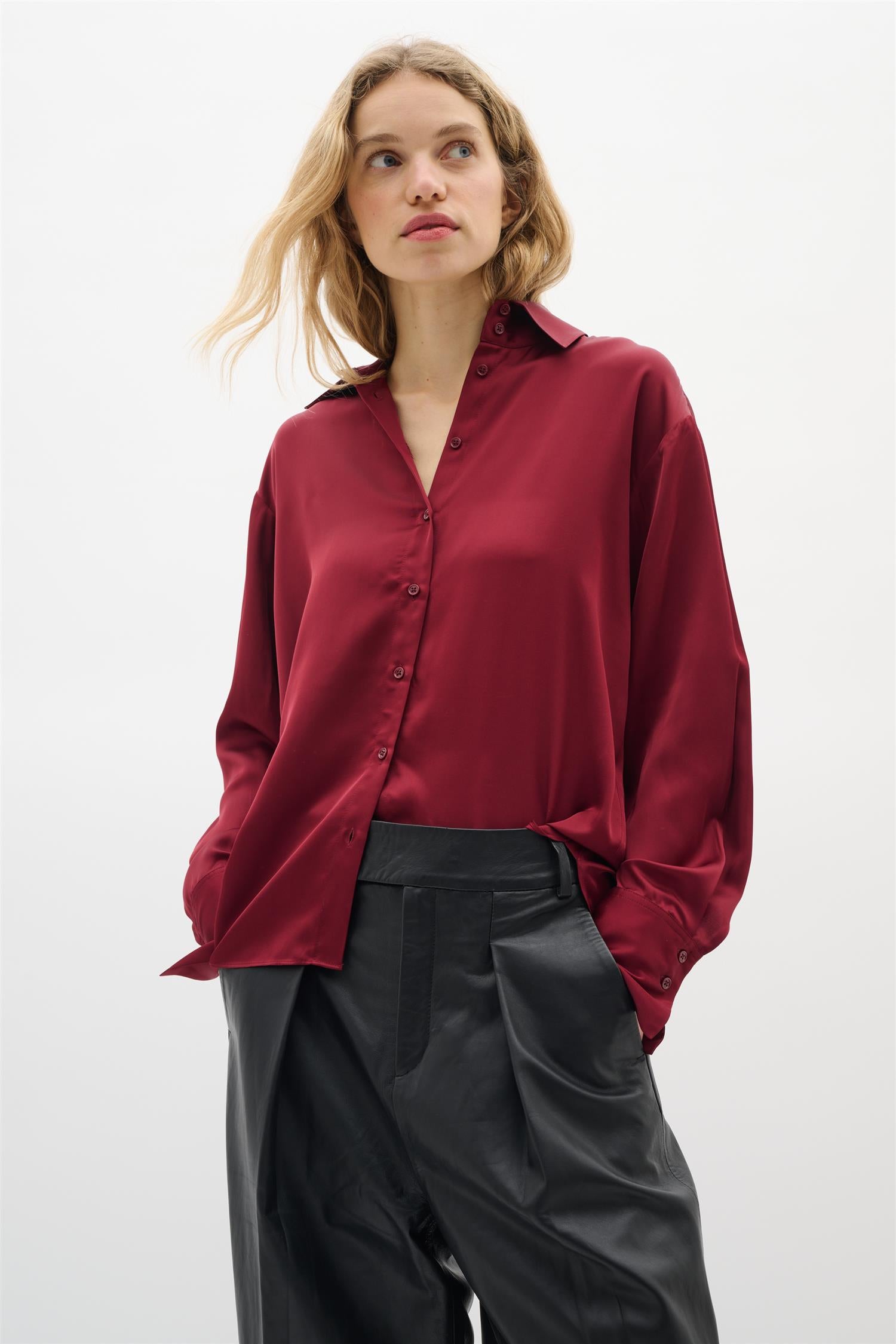 PaulineIW Shirt i en dyp Cabernet-farge er den perfekte kombinasjonen av stil og komfort. Denne skjorten har en løs passform som gir en avslappet, men likevel elegant look, ideell for både hverdagsbruk og spesielle anledninger.