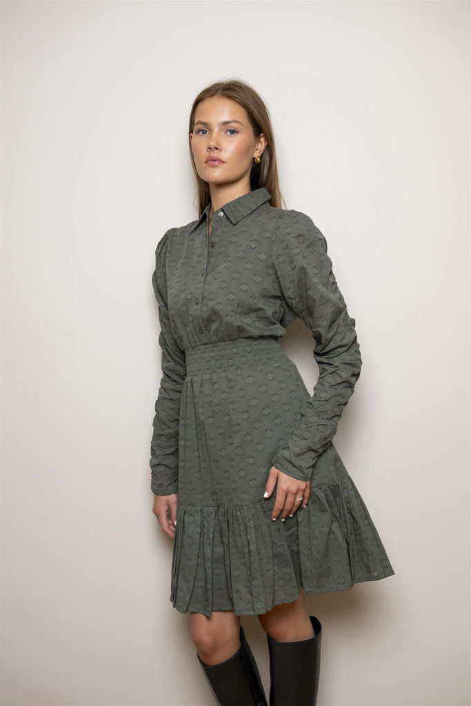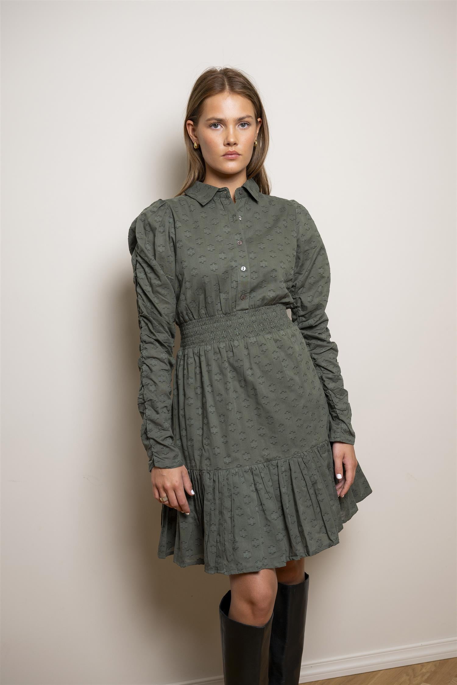 Billie Dress er en leken og feminin minikjole med smocket, innsvinget midje som fremhever silhuetten på en komfortabel måte. Kjolen har voluminøse pufferm, dekorative detaljer, knappelukking i front og delikate volanger. Nå oppdatert med en stilig krage som løfter uttrykket og gjør den perfekt til både hverdag og fest. Normal i størrelsen – velg din vanlige størrelse.