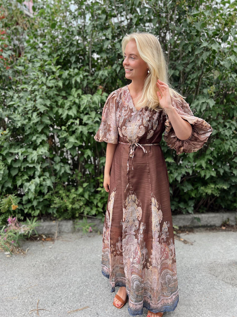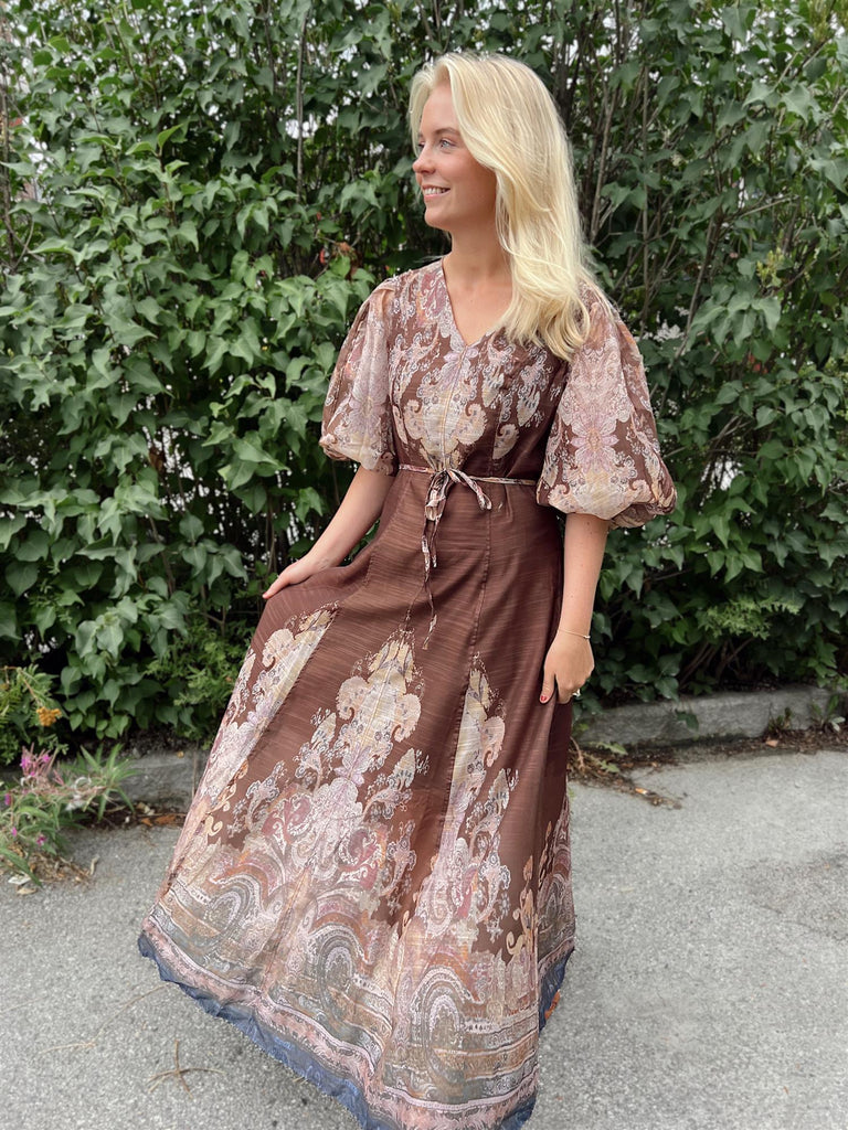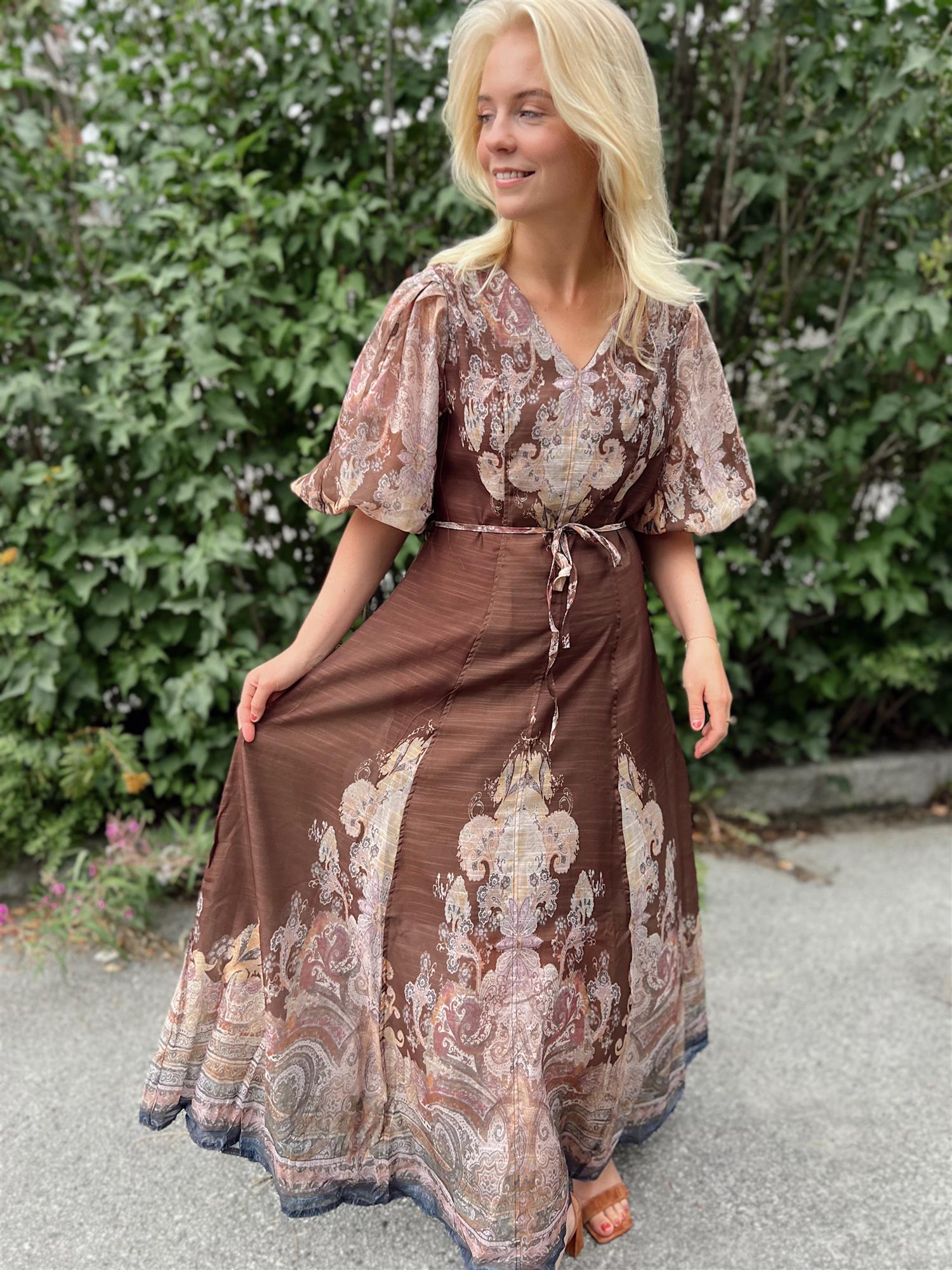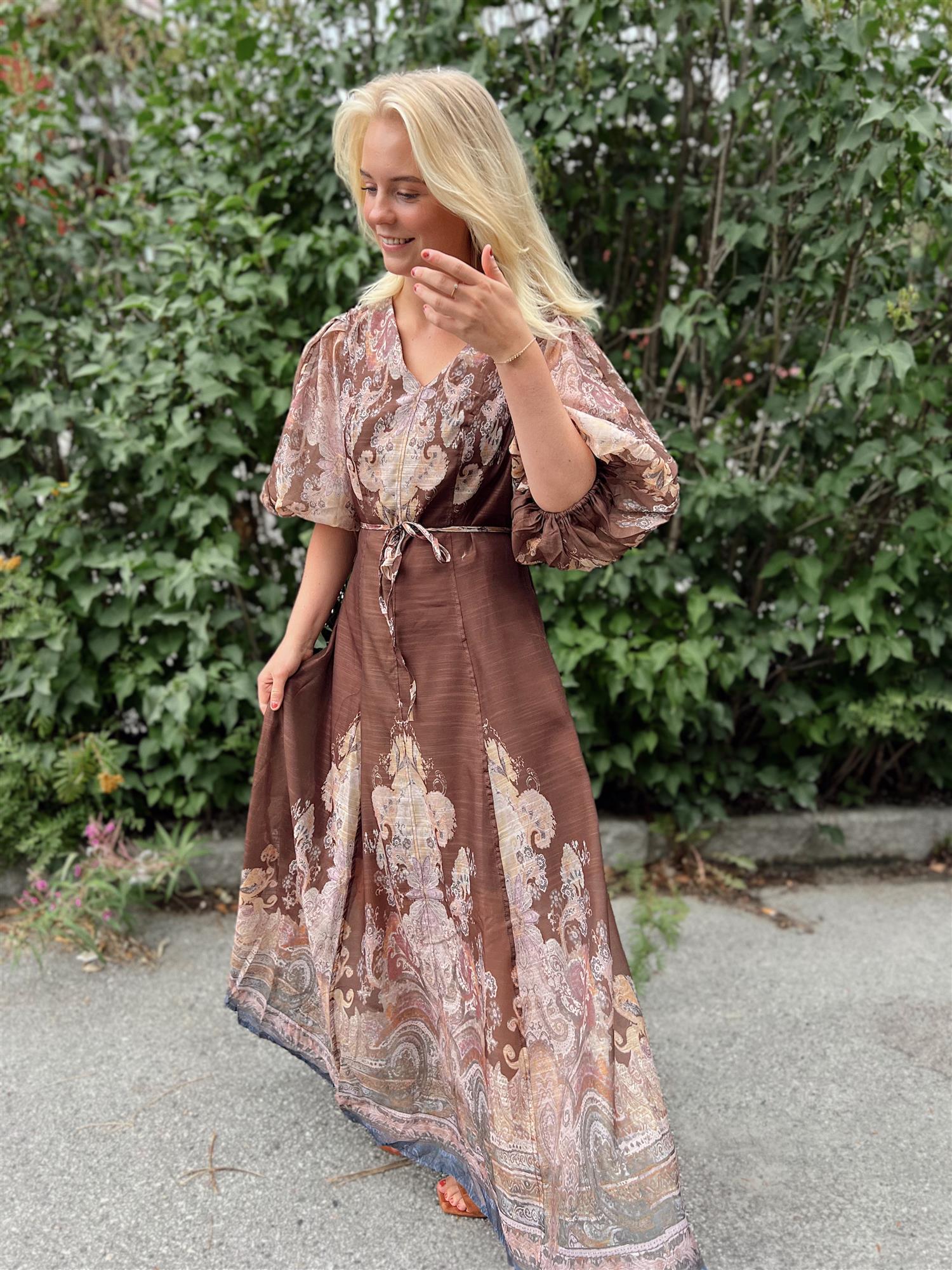 Denne lange, brune kjolen er et mesterverk av bohemsk stil. Det intrikate paisley-mønsteret gir et sofistikert preg, mens det flytende stoffet sikrer komfort og bevegelsesfrihet.