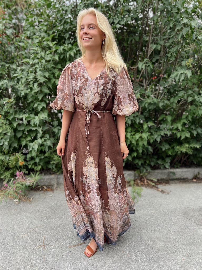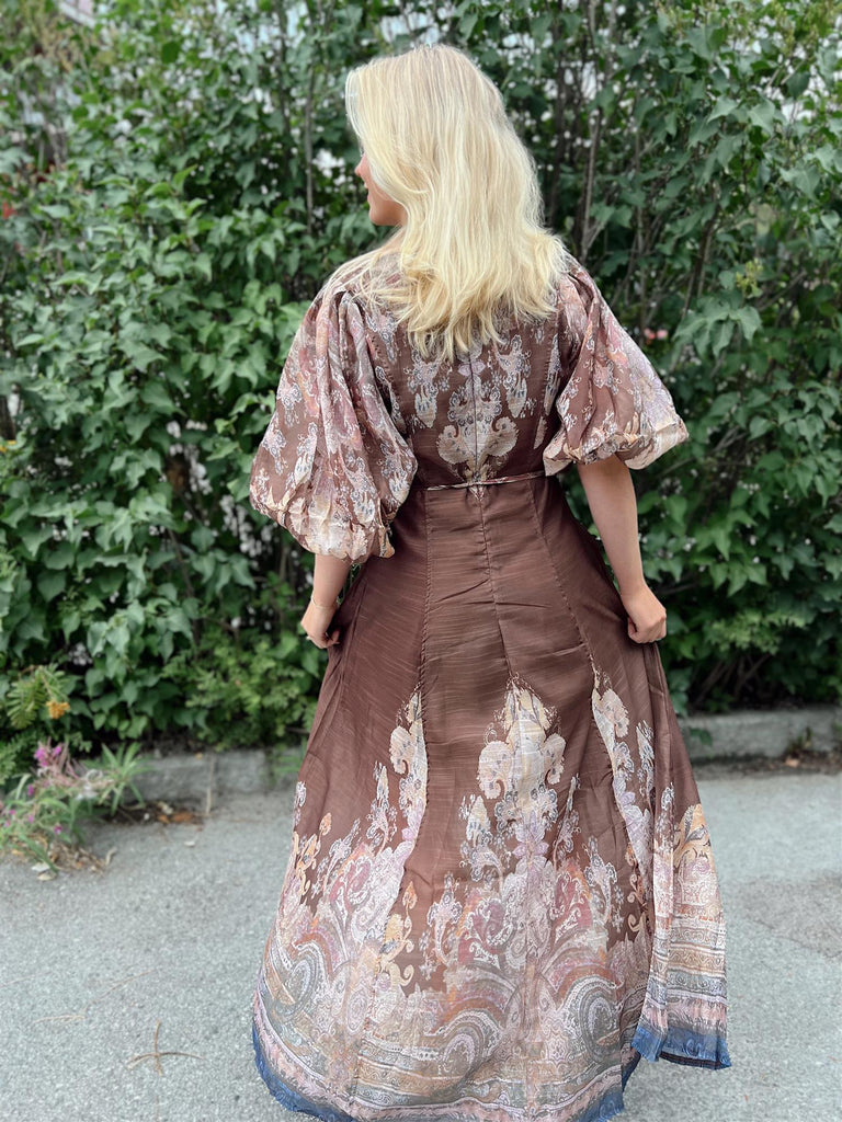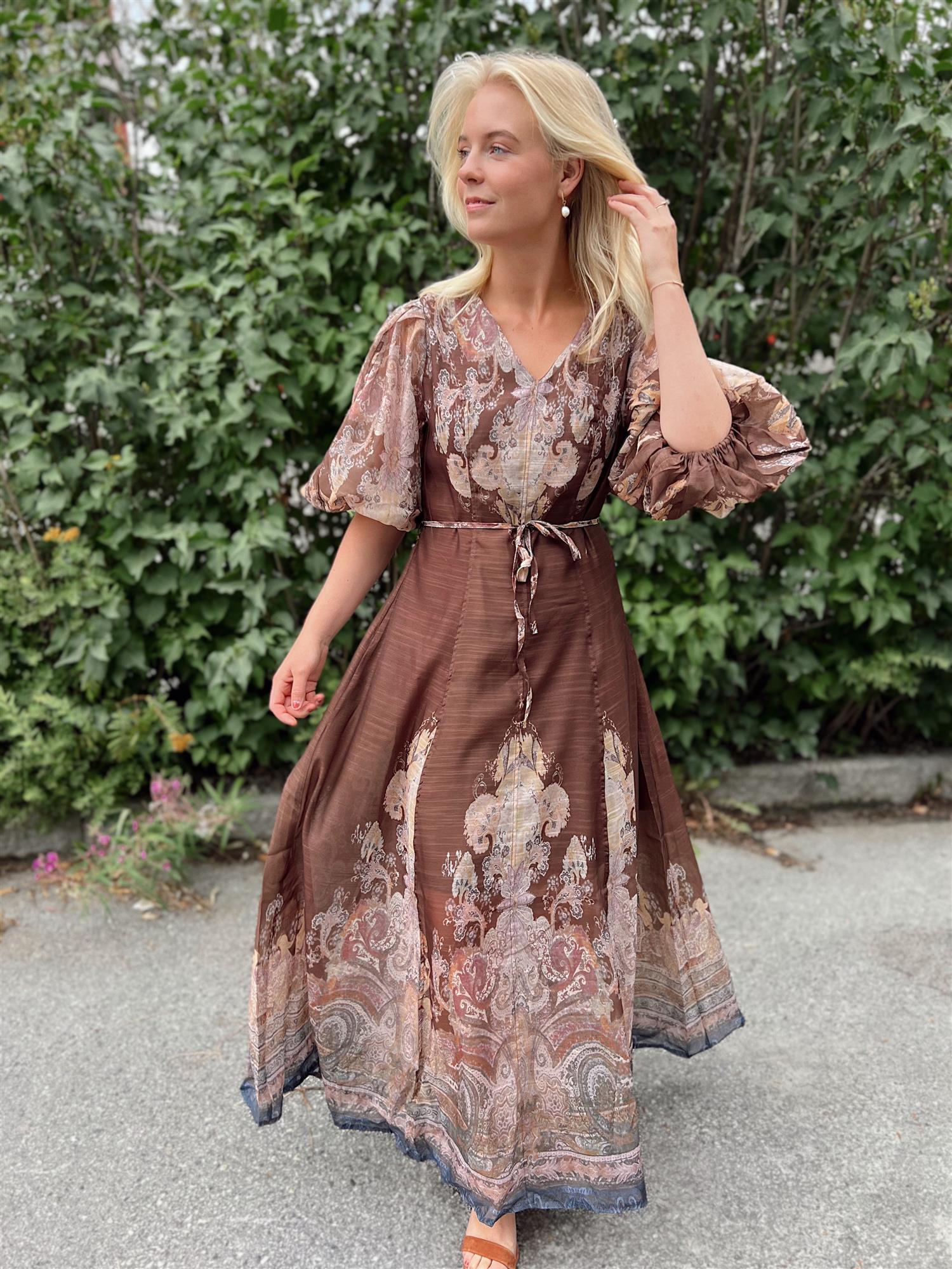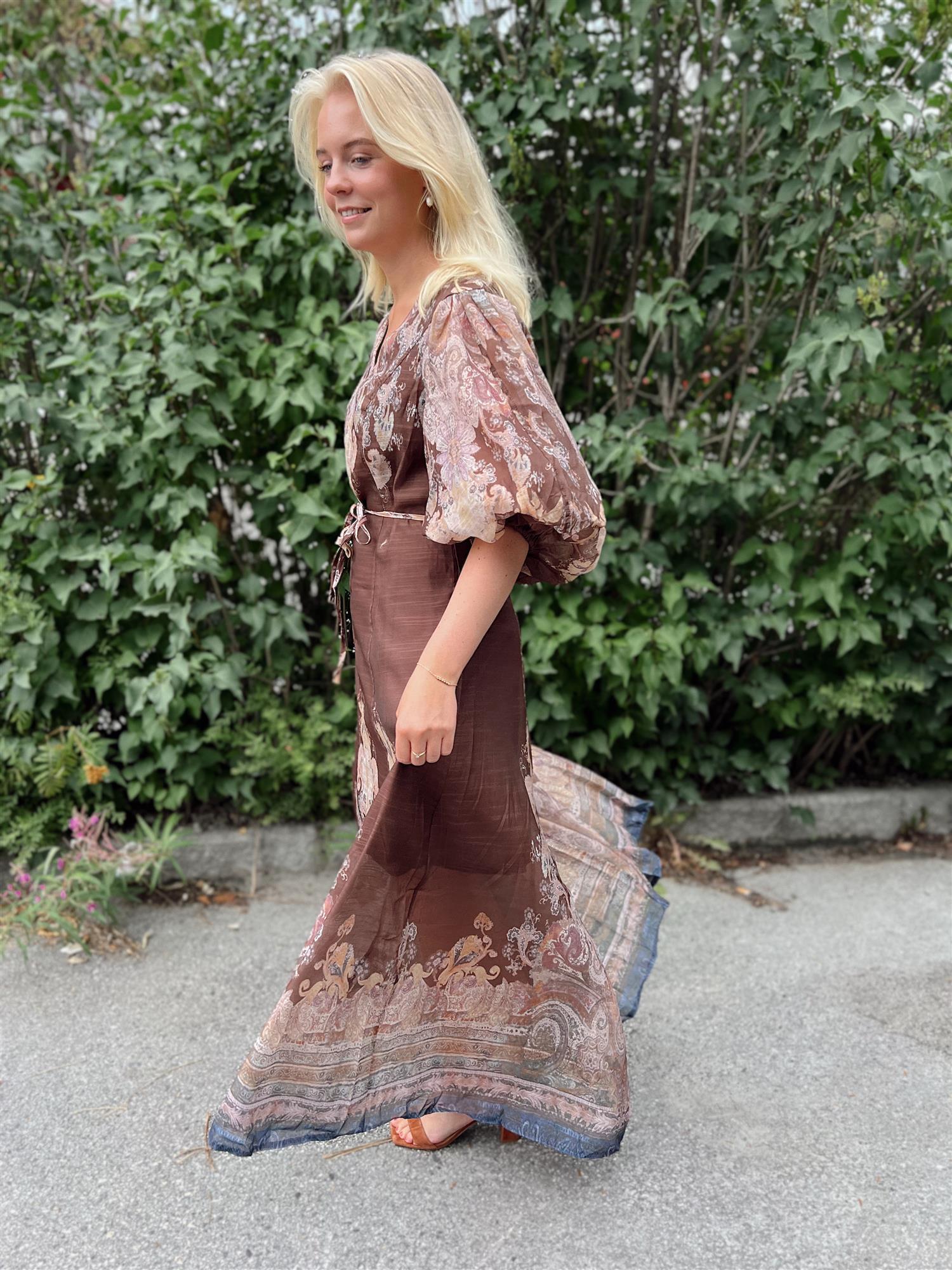 Denne lange, brune kjolen er et mesterverk av bohemsk stil. Det intrikate paisley-mønsteret gir et sofistikert preg, mens det flytende stoffet sikrer komfort og bevegelsesfrihet.
