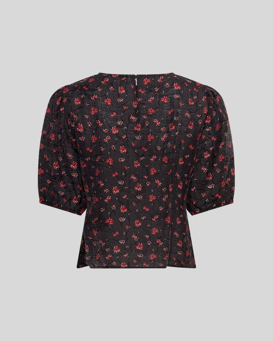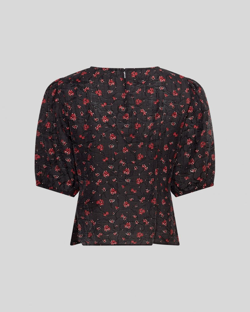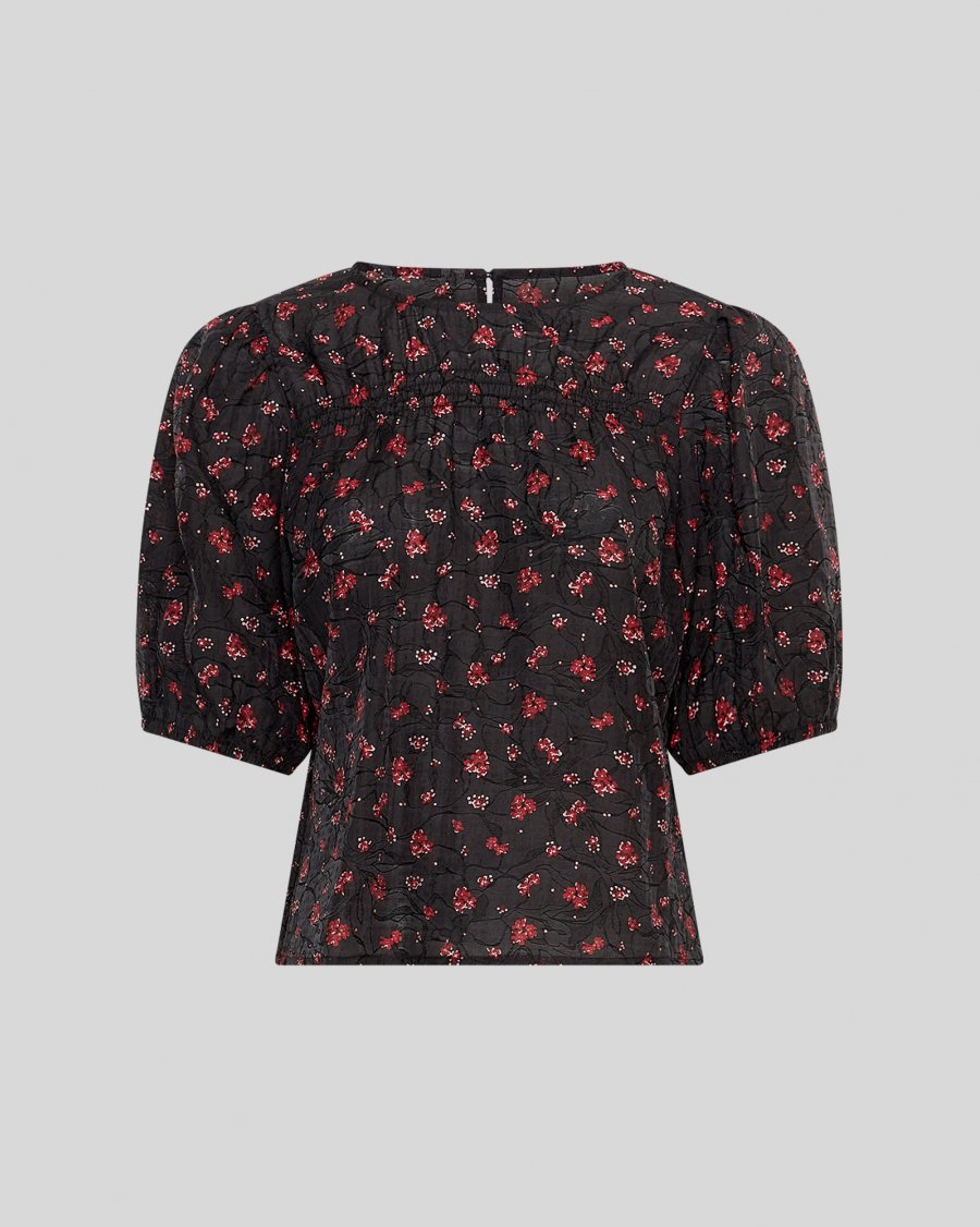 Nancy Top AOP er en sjarmerende bluse med 2/4-lange ermer som lett ballooner for et luftig og voluminøst uttrykk. Blusen har litt innsvinget midje som fremhever silhuetten, og smock-detaljer over brystet gir et mykt, romantisk preg. Laget i et lett stoff med heltrykt blomsterprint, perfekt for å tilføre hverdagsgarderoben et elegant uttrykk.