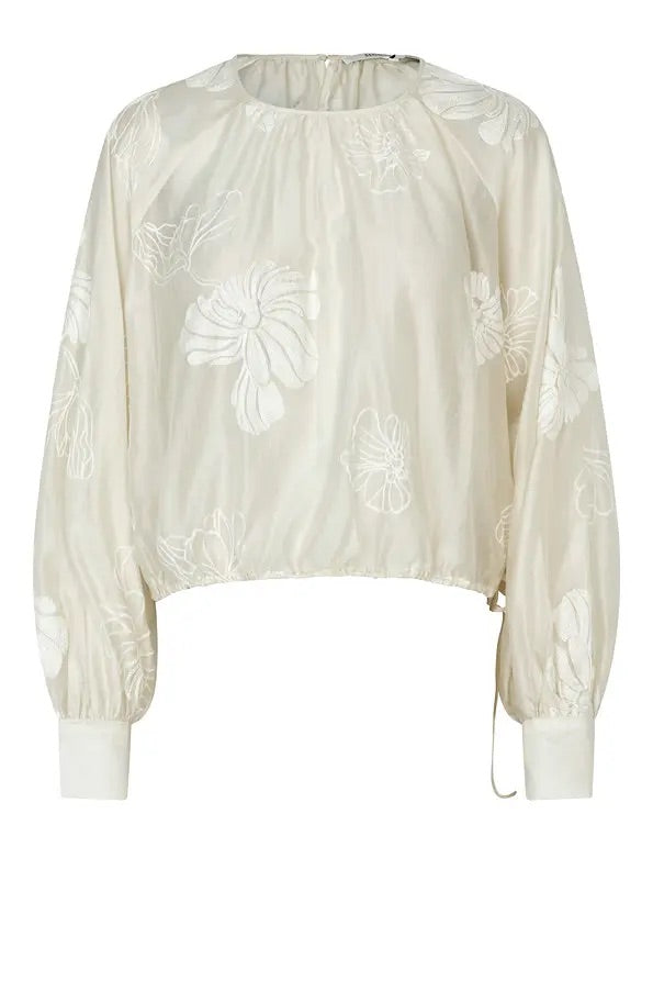 Veria Blouse er en elegant og lett bluse i myk lyocellblanding med subtil glans. Den har rund hals med liten nøkkelhullåpning bak, raglanermer med voluminøse mansjetter, og justerbar snøring i nederkanten for fleksibel passform. Den løse silhuetten gir et avslappet, men sofistikert uttrykk – perfekt til både hverdags og fest.