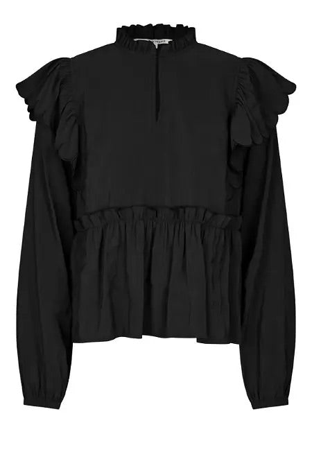 Elegant og feminin bluse i myk modalblanding med rund hals og nøkkelhullåpning med knapp. Voluminøse frynser på skuldre og nederkant, lange ermer med knappede mansjetter, og en luftig, avslappet passform som passer perfekt til både hverdag og fest.