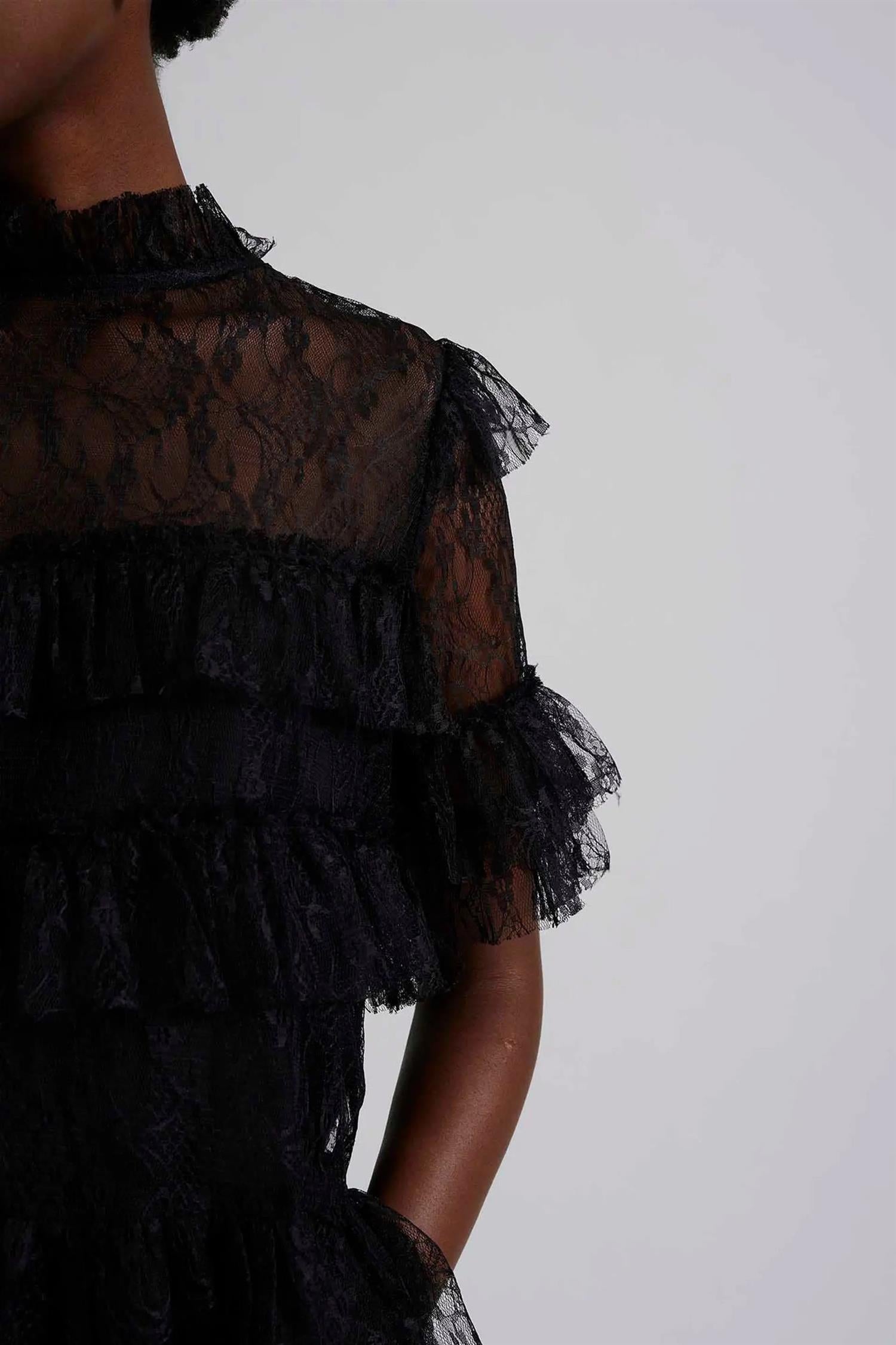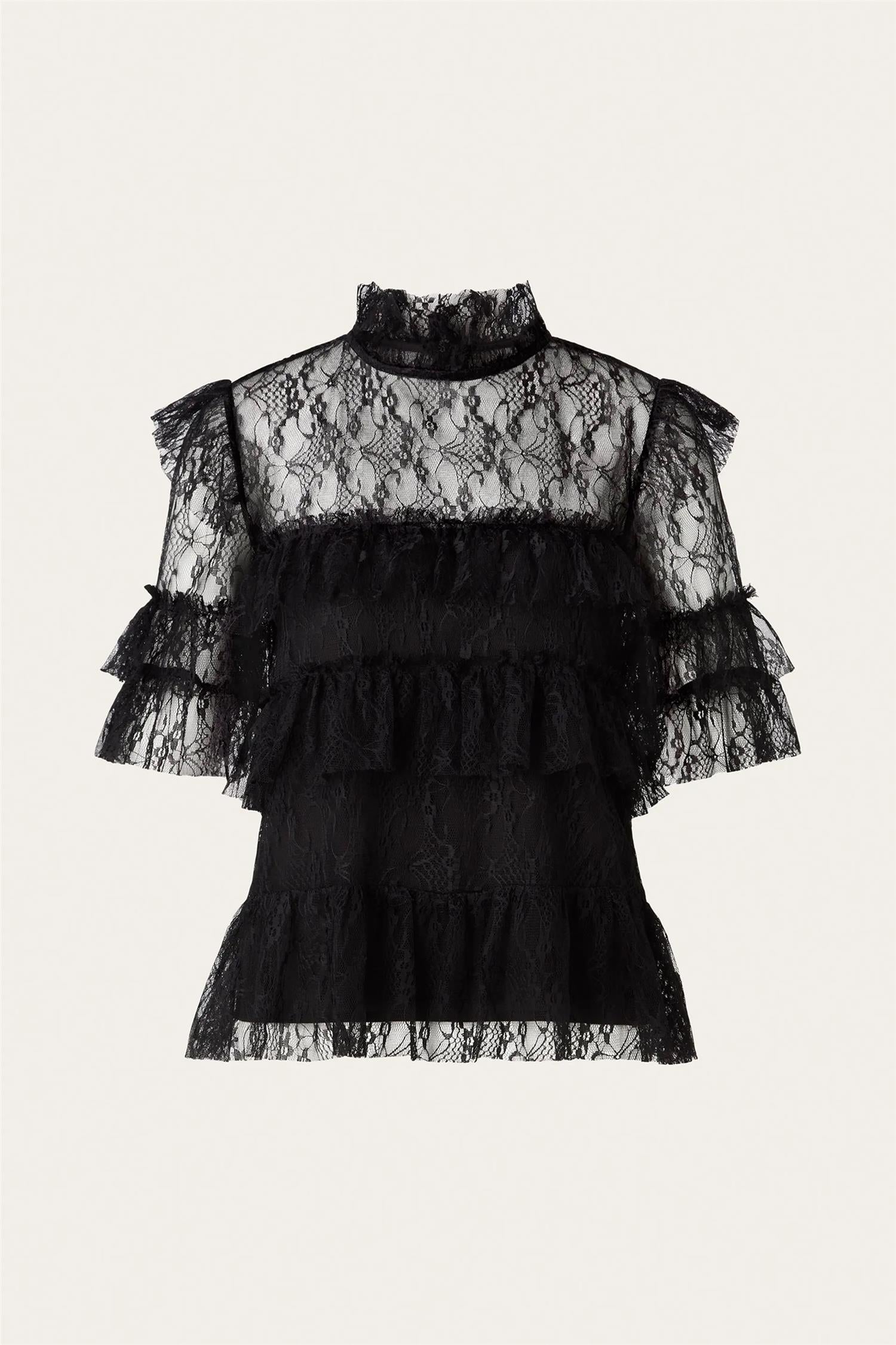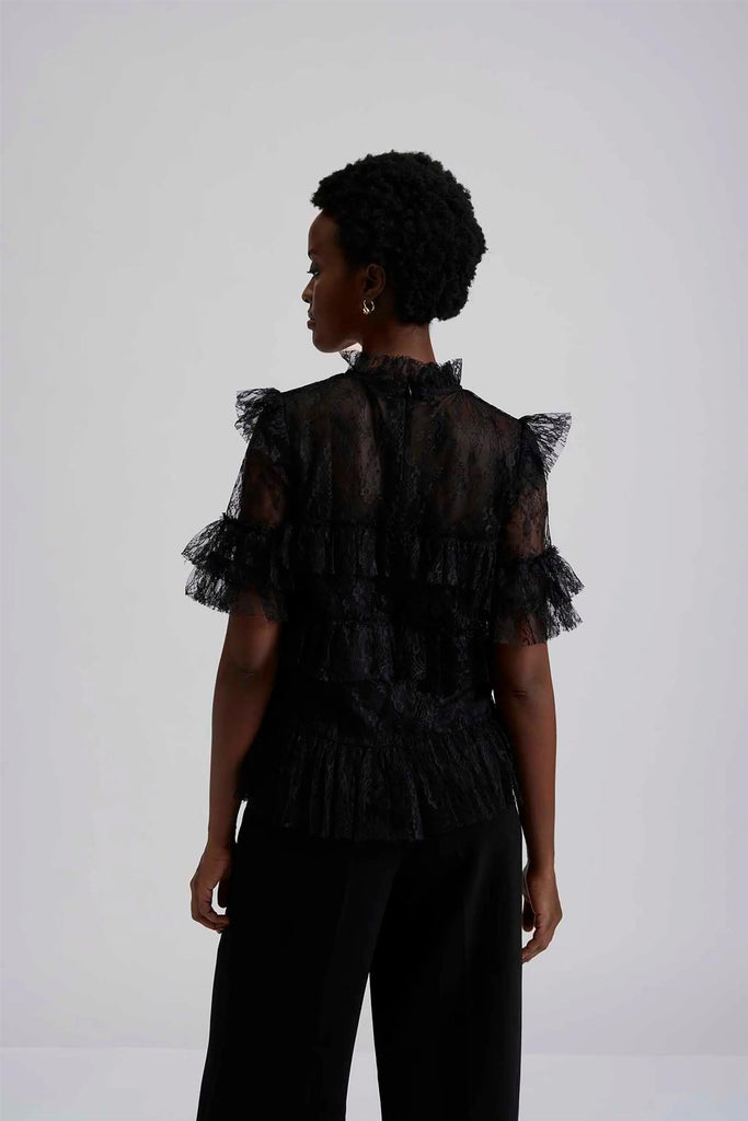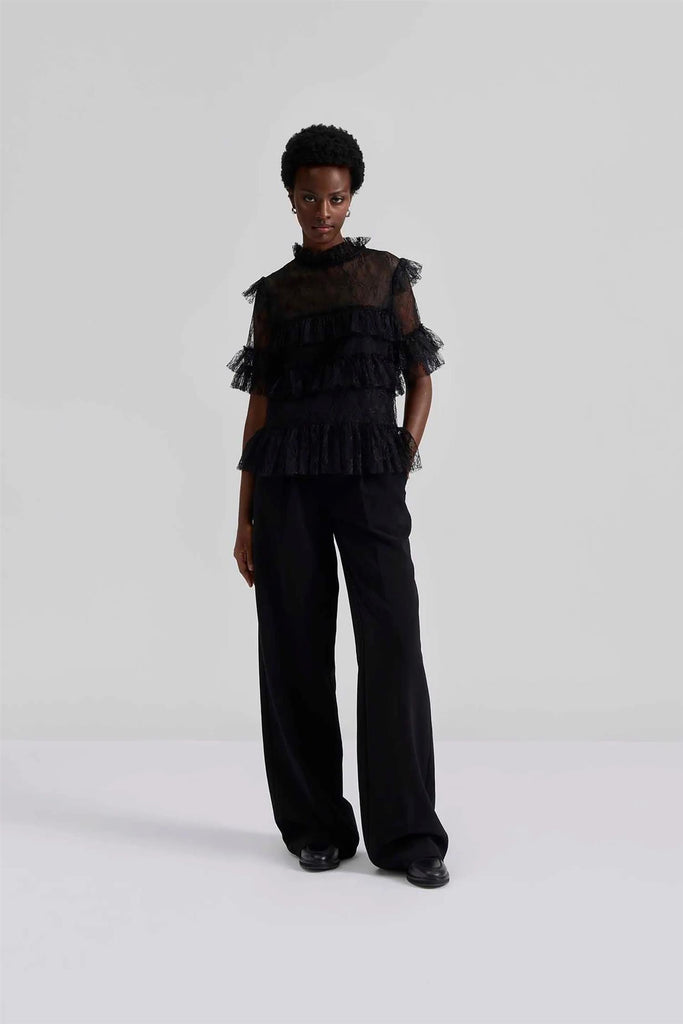 En feminin blondebluse med korte ermer, høy hals og delikate volangdetaljer. Den elegante passformen gjør den perfekt både til hverdags og mer pyntede anledninger. Lukkes med glidelås i ryggen for en flatterende silhuett.
