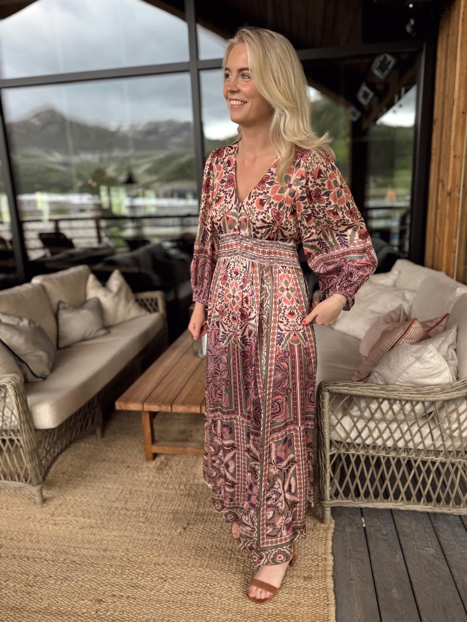 - Detaljer: Knapper ved halsen, 3/4-lengde ballongsleeve med elastisk åpning, påsydd lomme ved hoftene, usynlig dragkedje bak og smockpanel for en behagelig passform.