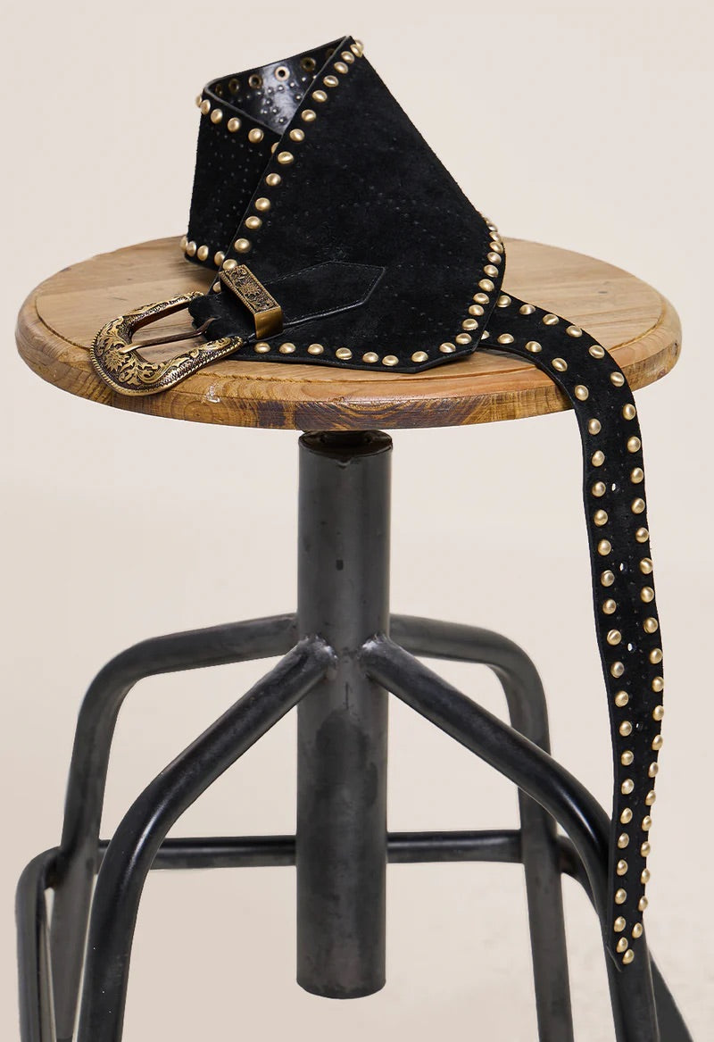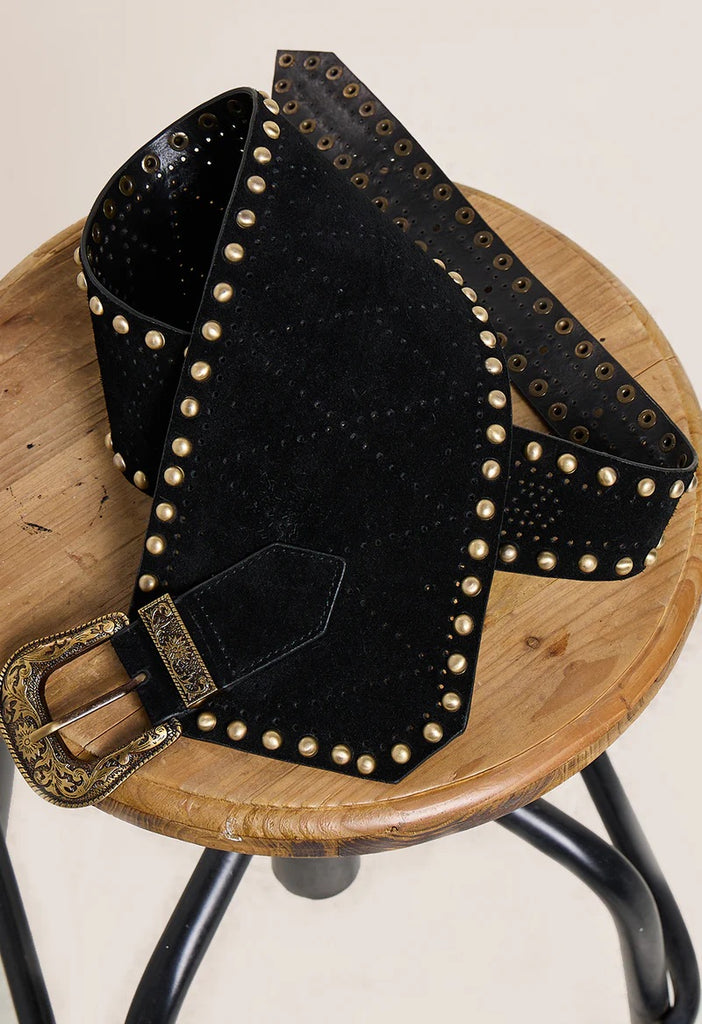 Gi antrekket et markant uttrykk med Eden Belt, laget i 100% semsket skinn med glatt skinnbakside for en eksklusiv finish. Beltet har et asymmetrisk design som fremhever midjen, og er utsmykket med en statement-spenne i metall samt metallnagler langs kantene.