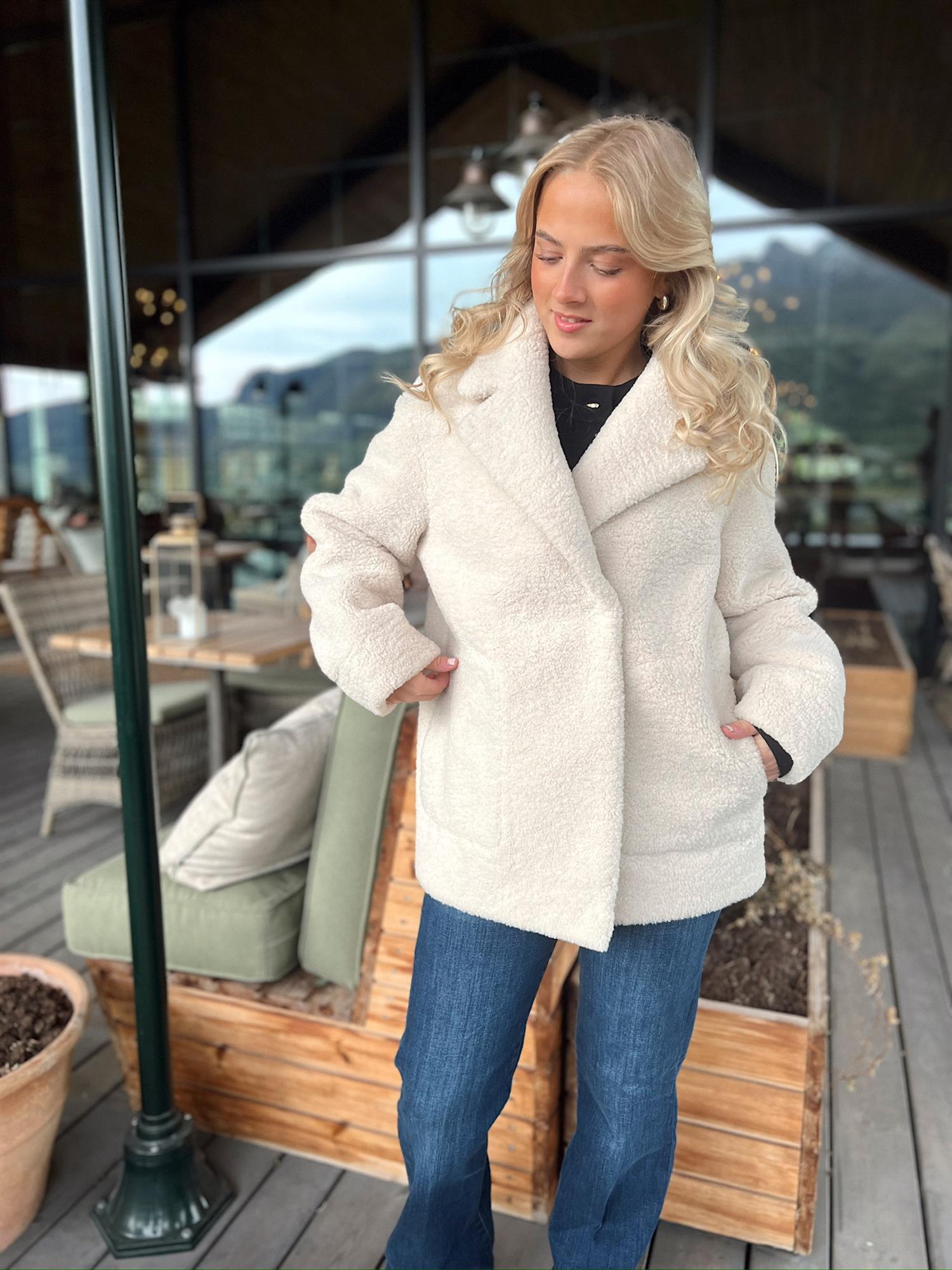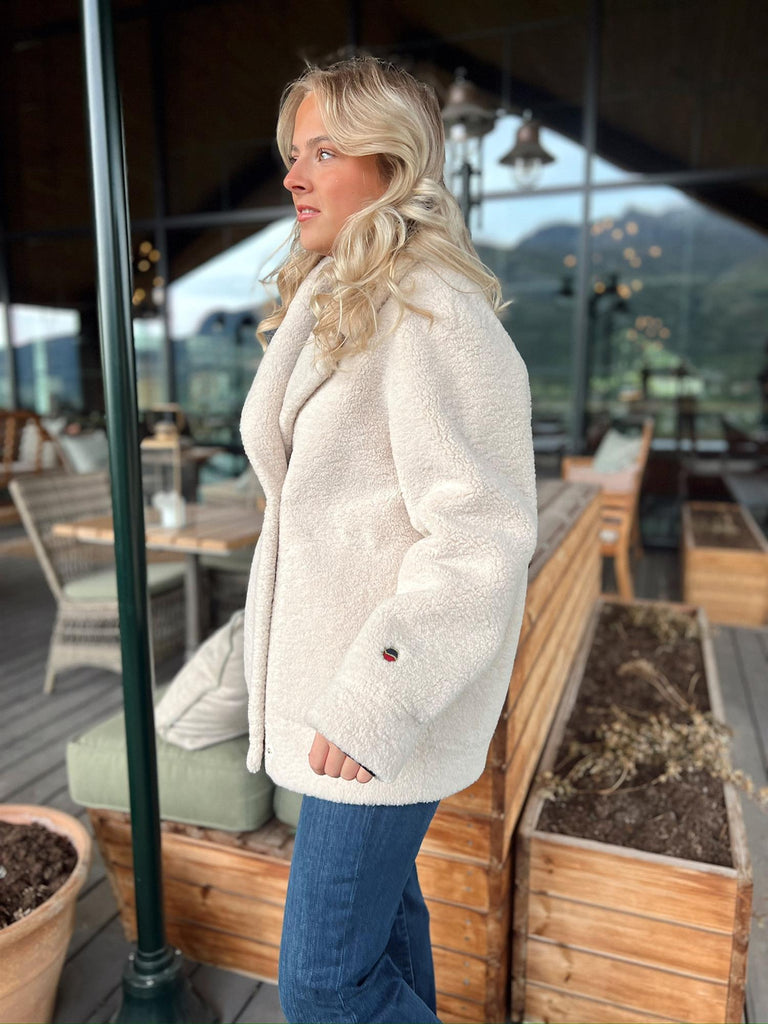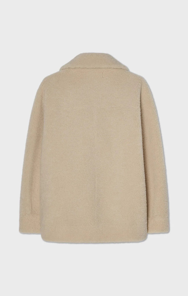 Mei Shearling Jacket er en myk jakke med en deilig, fluffy tekstur som gir den et luksuriøst shearling-uttrykk. Jakken har en lett oversized passform og en klassisk reverskrage som gir et sofistikert og tidløst design. Den har romslige lommer og den ikoniske Busnel-logoen diskret plassert på venstre håndledd, noe som gir et subtilt, men stilfullt preg.