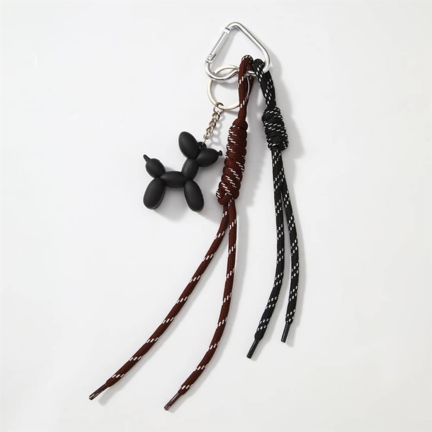 En kul og moderne nøkkelring med liten hundedetalj og flettede snorer i kontrastfarger. Perfekt for å gi vesken, nøklene eller ryggsekken et lekent og personlig preg. Lett å feste og et morsomt tilbehør til hverdagsbruk.