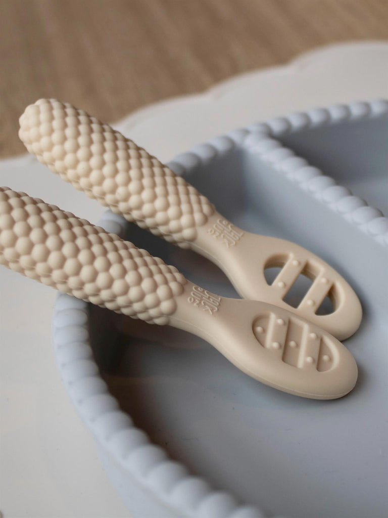 Begge skjeene har små sensoriske prikker på sidene som gir mild lindring for ømme gommer under tannfrembrudd. Det lekne, bobleinspirerte designet gjør dem enkle for små hender å holde i.