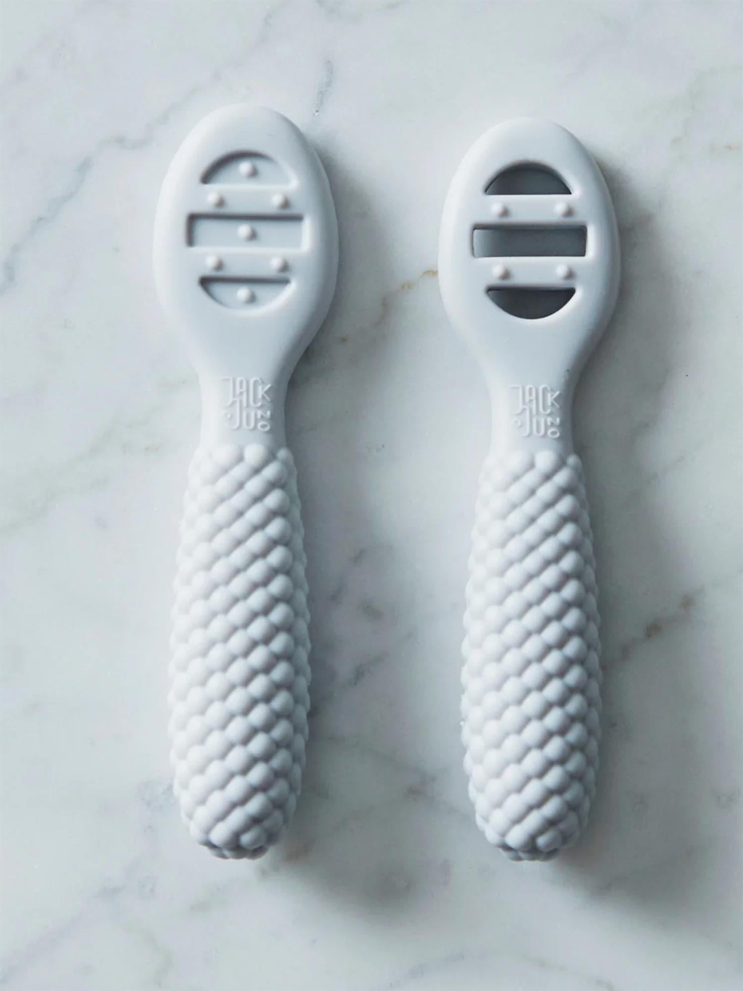 Begge skjeene har små sensoriske prikker på sidene som gir mild lindring for ømme gommer under tannfrembrudd. Det lekne, bobleinspirerte designet gjør dem enkle for små hender å holde i.