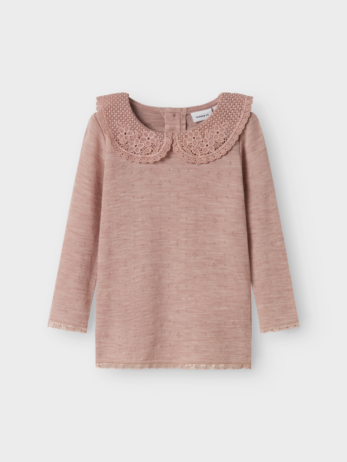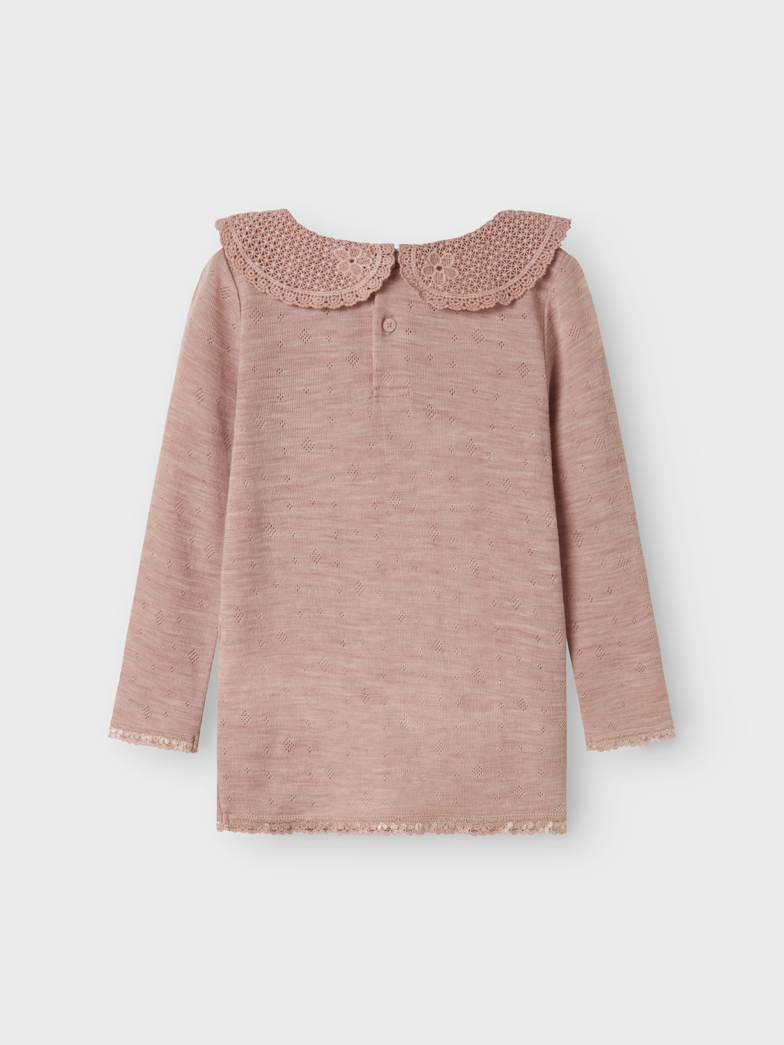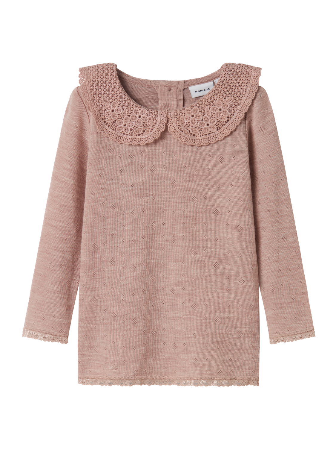 Legg til et stilig og komfortabelt plagg i barnets garderobe med NMFWANG WOOL NEEDLE LS TOP W/COLLAR. Denne toppen er laget av myk merinoull, som gir varme og pusteevne, perfekt for kjøligere dager. Den har en søt blondedetalj og en klassisk O-hals, noe som gjør den til et flott valg for spesielle anledninger.