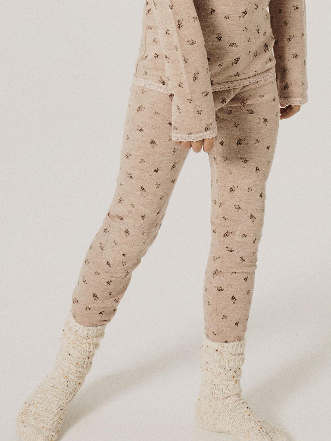 Leggings i myk og komfortabel merinoull som gir barnet ditt en stilfull og behagelig look. Med unike mønstre og detaljer som blondedetaljer og knelapper, er disse leggingsene perfekte for å tilføre en søt touch til garderoben.