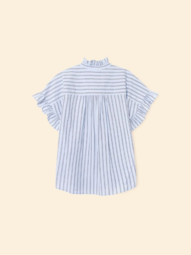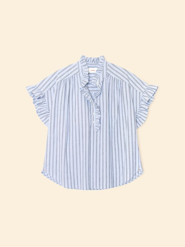 Brie Top fra Xirena er en avslappet og feminin bluse laget i myk og luftig bomull. Med sitt lette stripemønster, delikate volangkanter og flatterende v-hals med rysjer, gir den et avslappet, men gjennomført uttrykk. De korte ermene med volangdetaljer gir plagget en leken og sommerlig følelse. Perfekt til både jeans og shorts – denne toppen blir garantert en favoritt i garderoben sesong etter sesong.