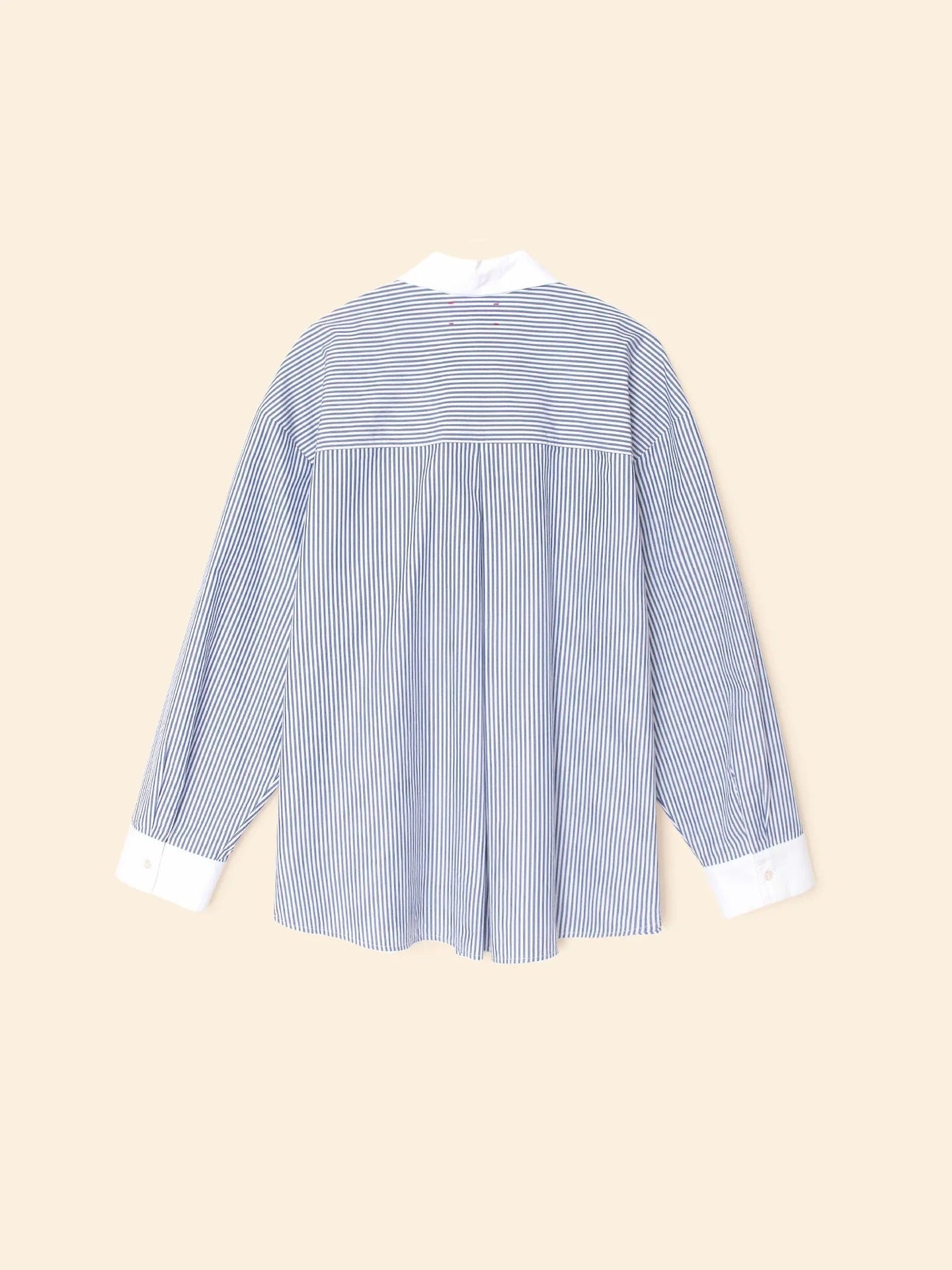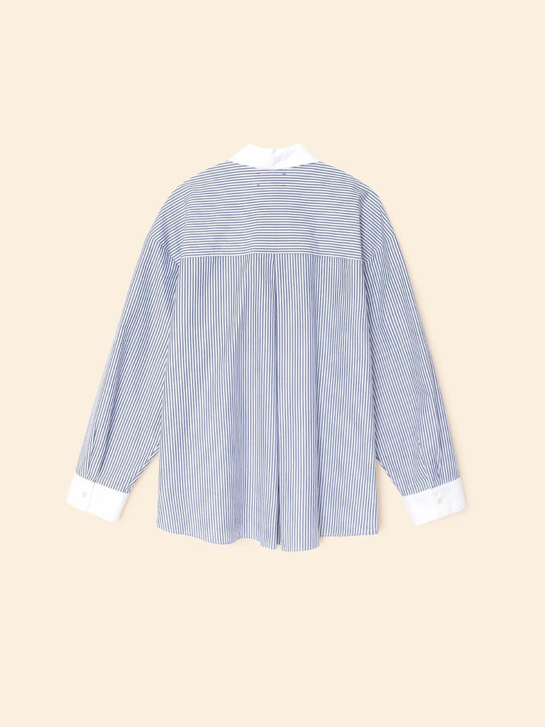 True Blue James Shirt fra Xirena er en avslappet og stilren skjorte i myk, strukturert bomull. Skjorten har knappestolpe, kontrastkrage og mansjetter, høy-lav kant med sidesplitter, og et bakstykke med innsvingt legg som gir et elegant og moderne uttrykk.