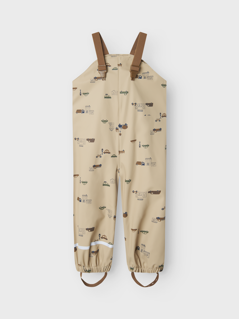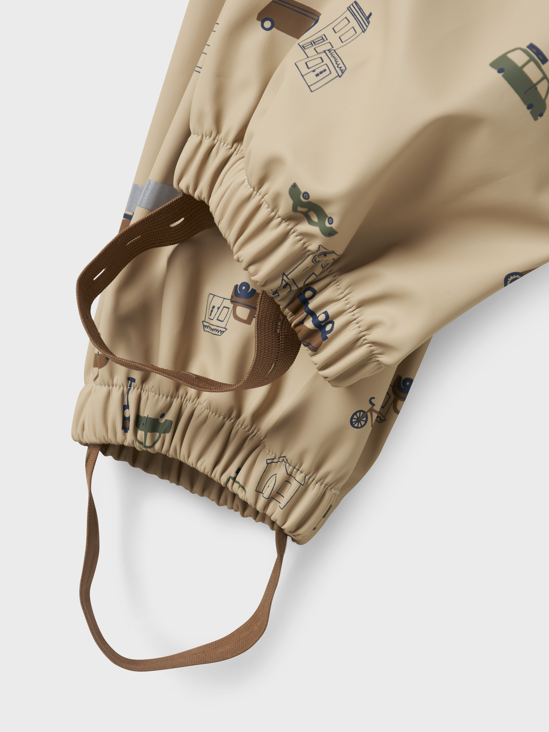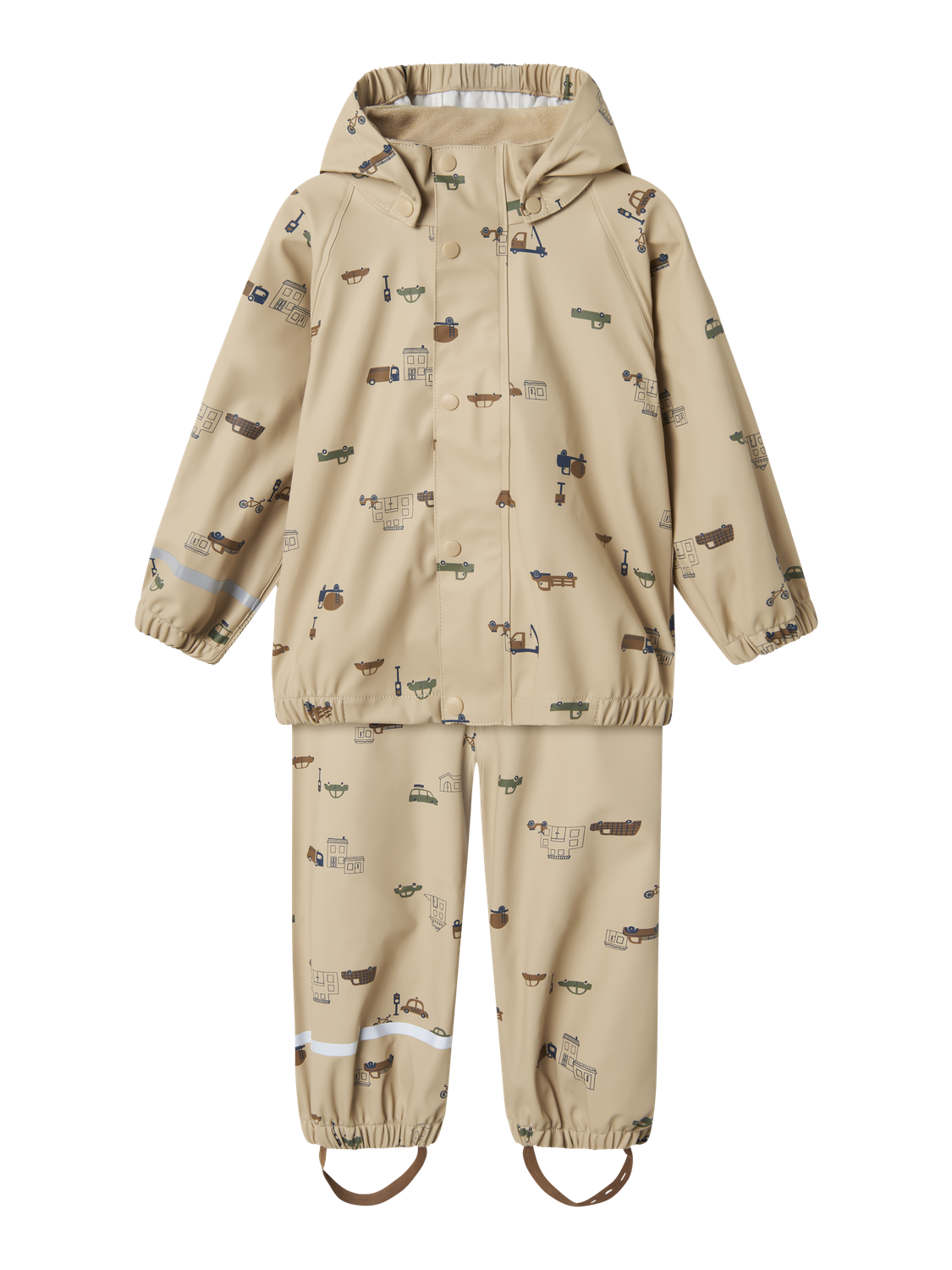 Hold barnet ditt tørt og komfortabelt hele dagen i dette tekniske regntøyet som er perfekt til lek og moro utendørs. NAME IT har produsert yttertøy av høy kvalitet siden 1986, med spesielt fokus på funksjonalitet og sikkerhet. Vi holder oss oppdatert på aktuelle motetrender, som vi forvandler til komfortabelt yttertøy for barn. - Produkttype : Regnsett - Funksjonalitet : Vanntetthet 10.000mm, Sveisede sømmer brukes til regntøy i polyuretan for en fullstendig vanntett beskyttelse - Hals : Avtakbar hette - Mansjetter : Elastiske mansjetter - Stropper : Justerbare seler - Lukking : Glidelåslukking - Ben detaljer : Avtakbare og justerbare elastiske stropper for en behagelig passform rundt foten, Elastisk detalj - Detaljer : Dekorative refleksdetaljer, Avtakbar hette for sikkerhet, Glidelåsbeskytter for å hindre at glidelåsen tar tak i huden - Mønster : Printet er gjentatt over hele overflaten av produktet
