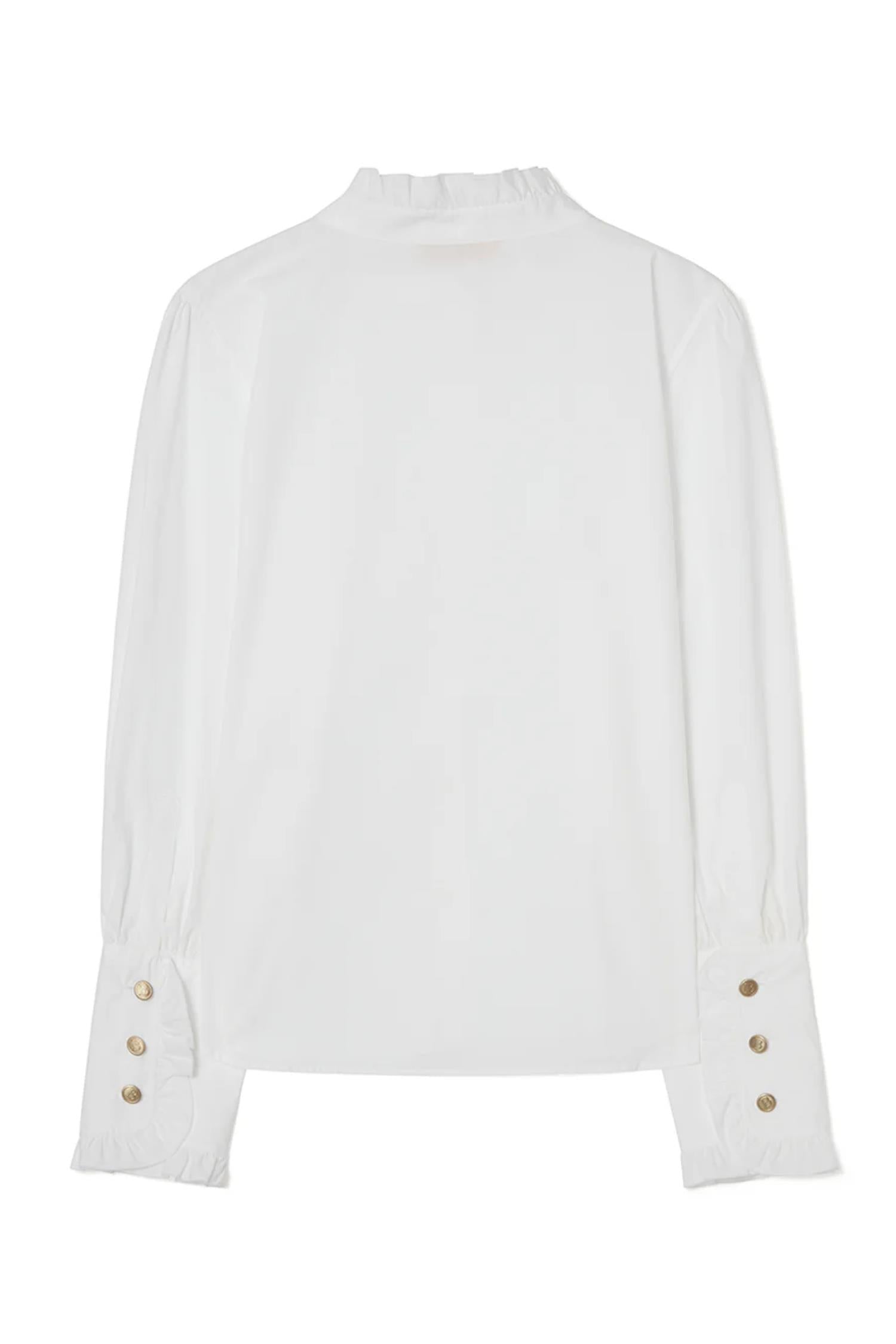 Enkelt design med fine detaljer ved krage og mansjetter. Volang ved krage og nederst på ermene. Gullfargede knapper ved kragen og på enden av ermet. Kneppes i front, knapper skjult i knappestolpen.