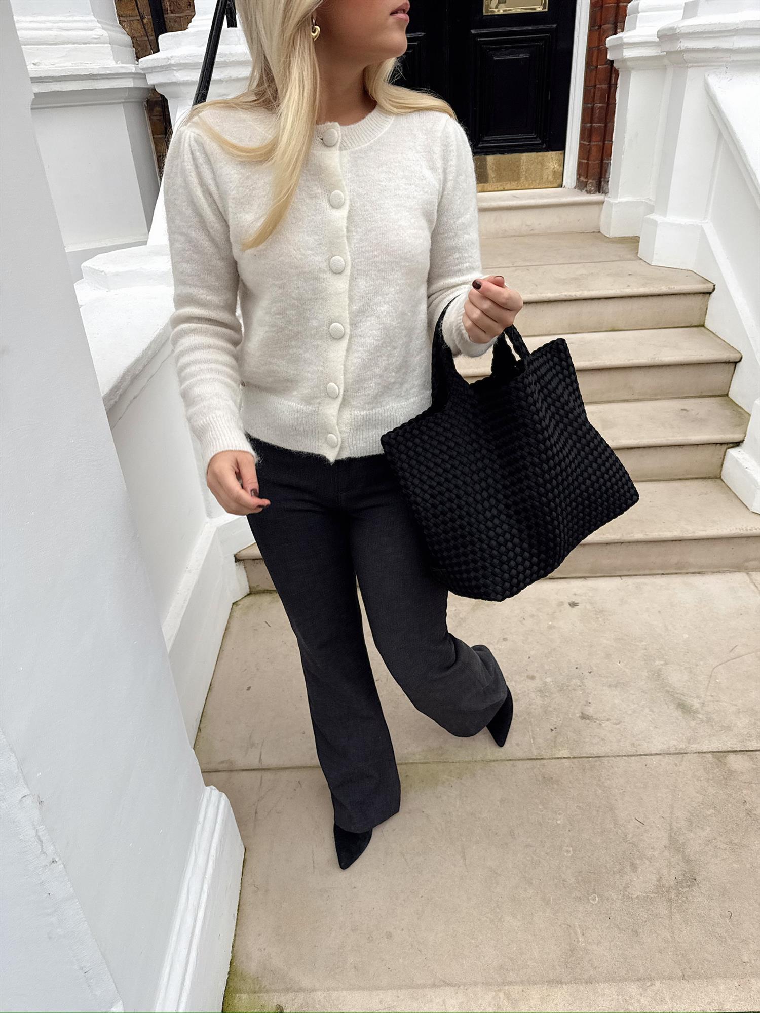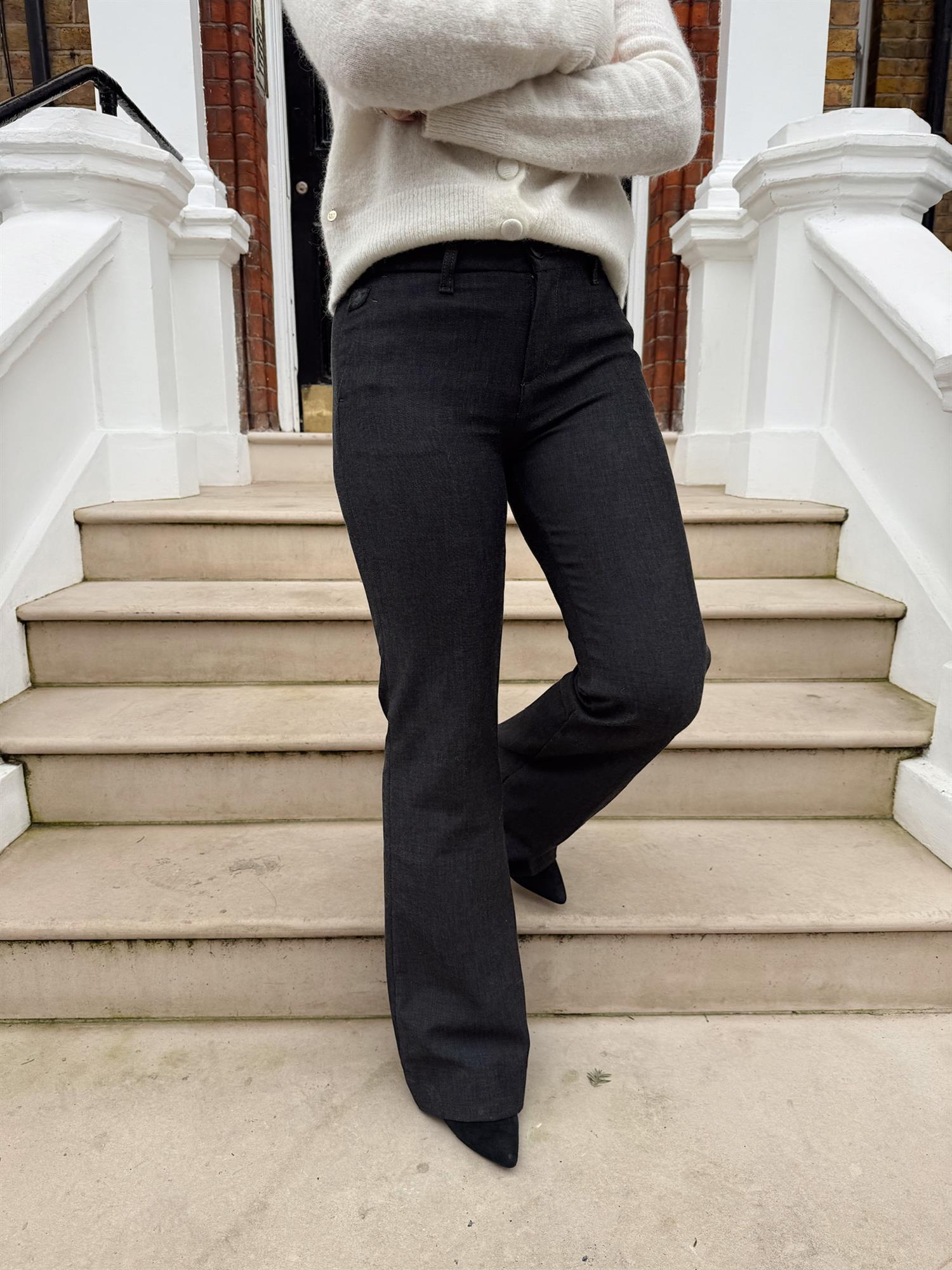 Silvia er en dress bukse med smal passform over hofter og lår, og lett utsvinget fra kneet og ned. Laget i et førsteklasses stoff som ligner ull, men som er elastisk og skånsomt mot huden. Den fine mørkegrå melerte fargen, gjør buksen til en tidløs klassiker.