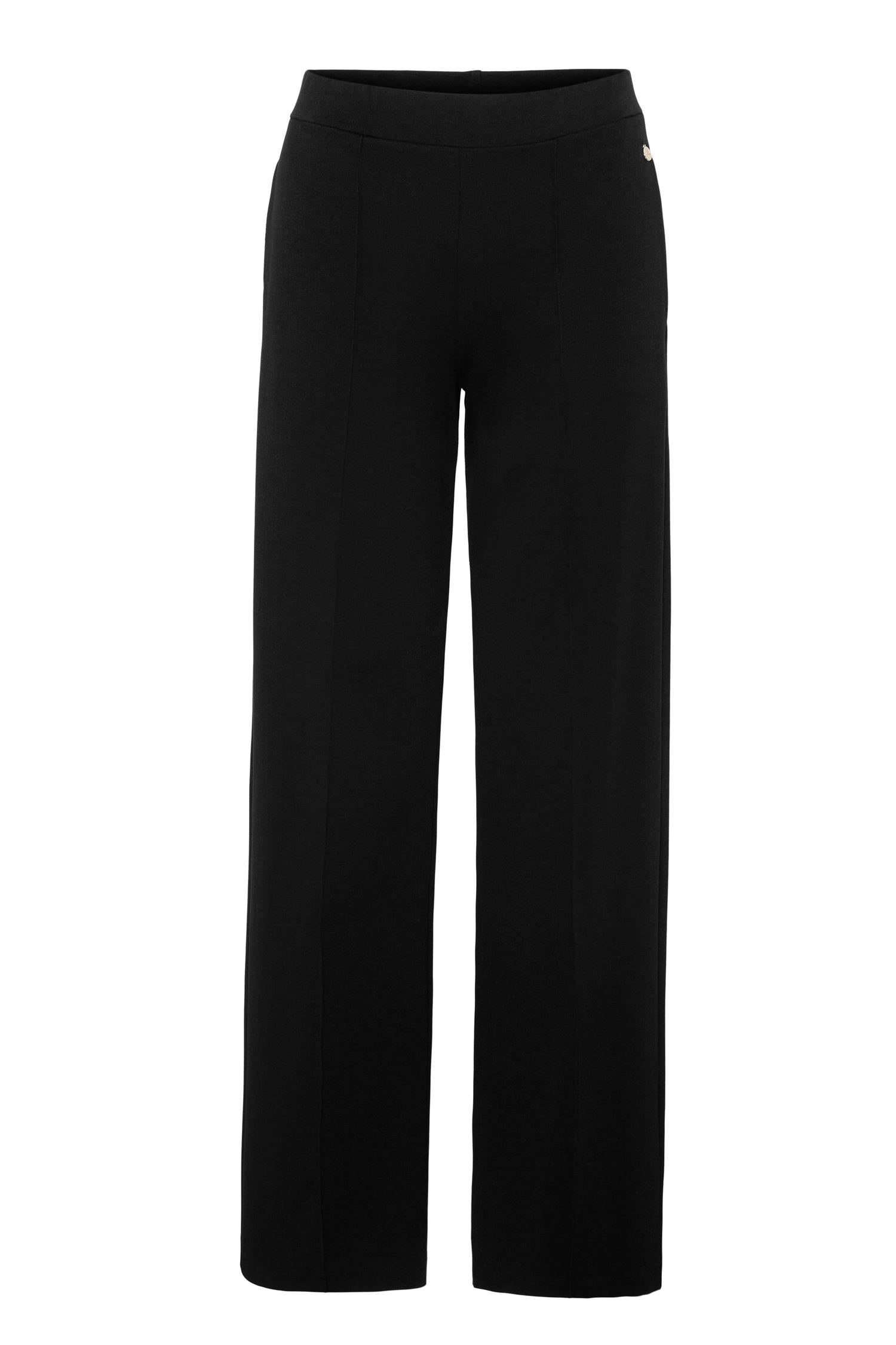 Komfortabel og kledelig bukse som sitter over hoftene og har rette vide ben nedover. Strikk i midjen, lommer i sidene og legg-stripe i front.