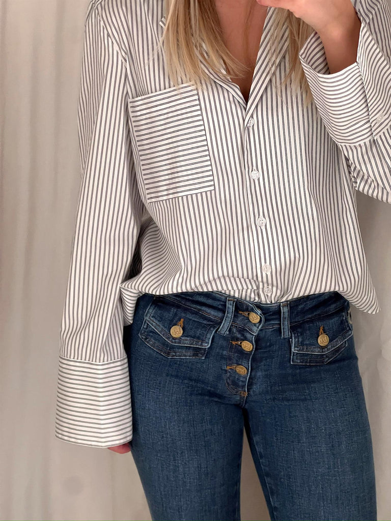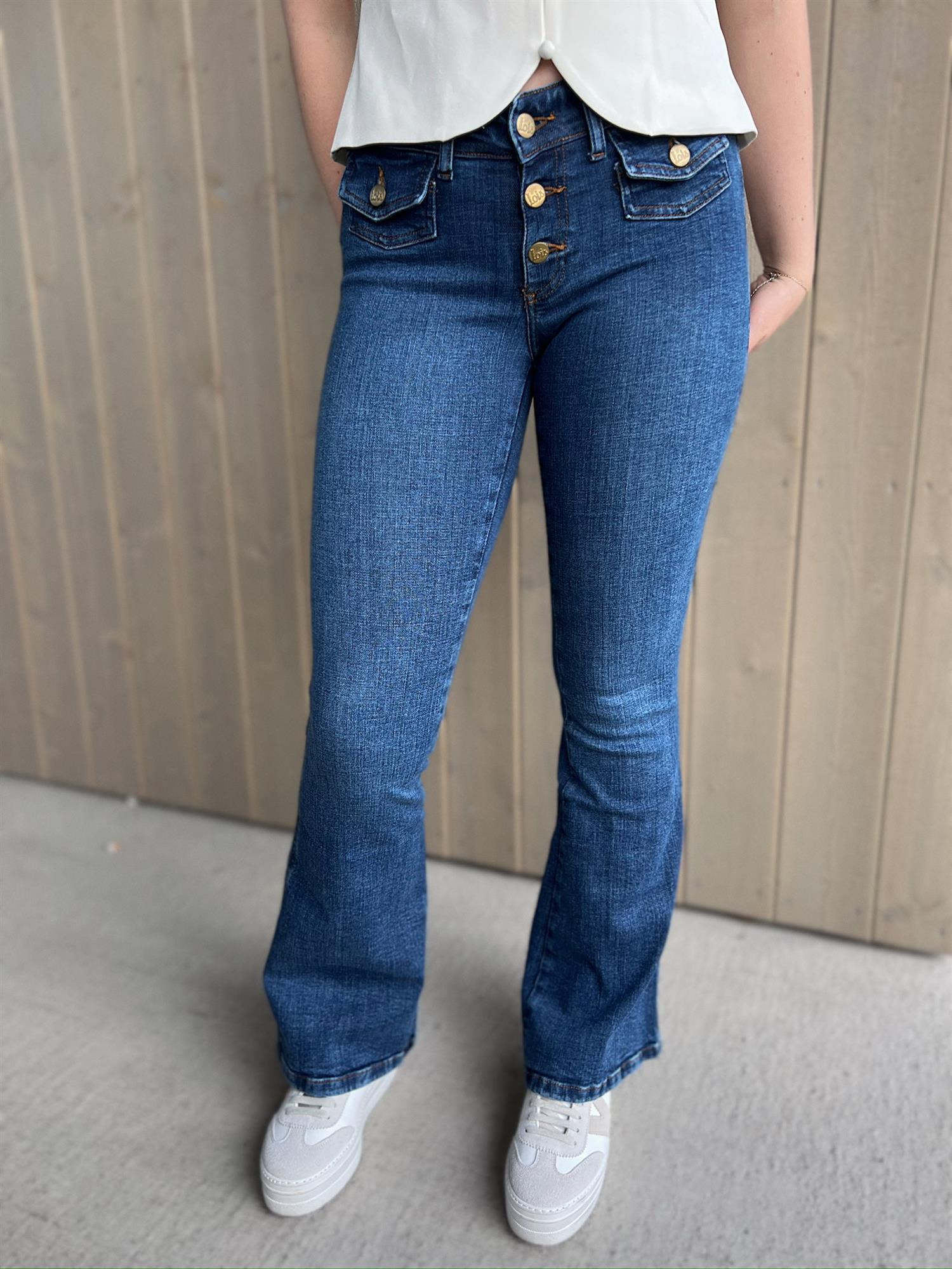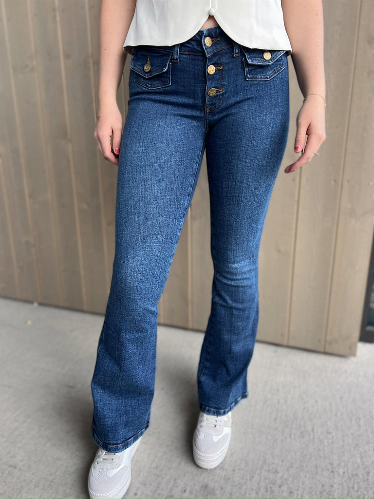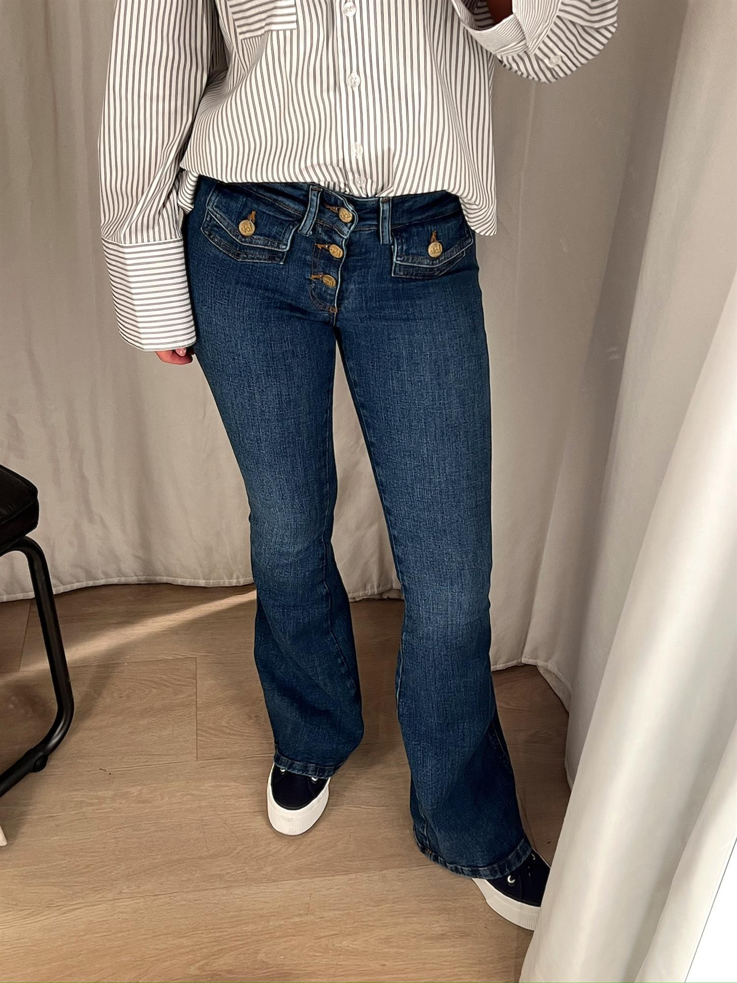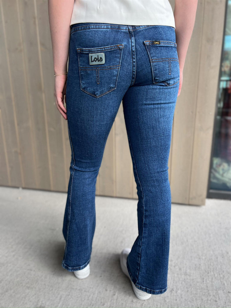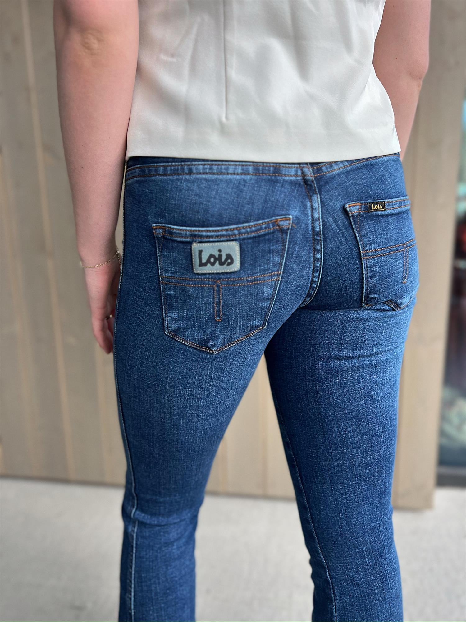 Yoko 22 fra Lois Jeans er den perfekte kombinasjonen av retrovibber og moderne snitt. Denne trendy slengbuksen har et lavt liv og en kroppsnær passform over hofter og lår, før den svinger elegant ut fra kneet og ned – en silhuett som fremhever figuren på en flatterende måte. De dekorative klafflommene foran og den synlige knappegylfen gir buksene et distinkt, nostalgisk preg som skiller seg ut.