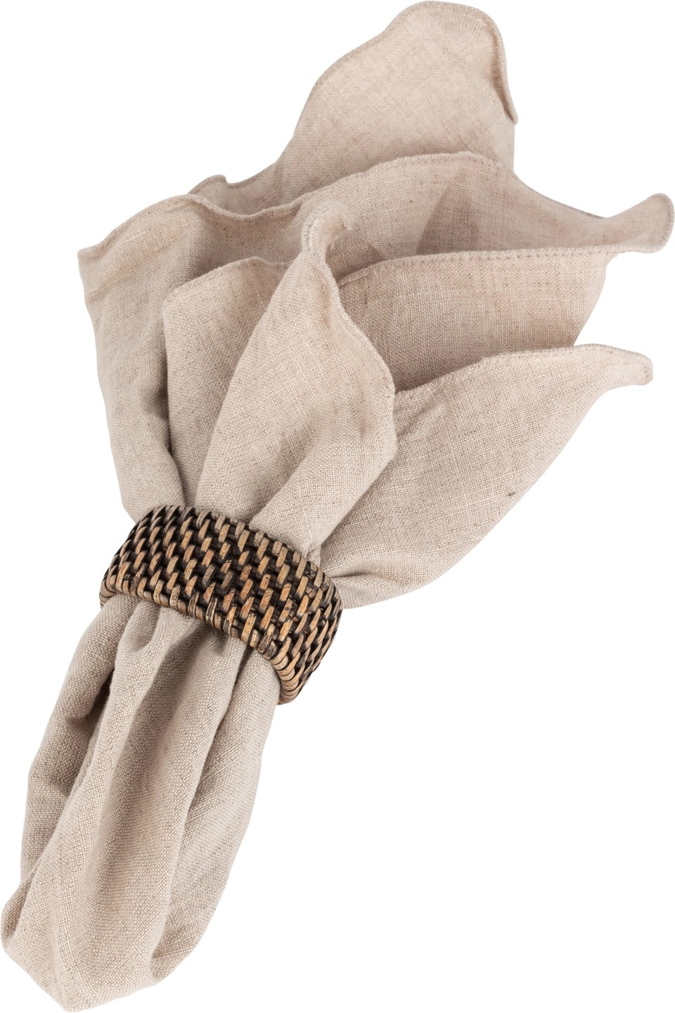 Sett med 4 stk serviettringer i flettet rattan. Ringene har en lett avrundet fasong og et vakkert fargespill mellom det mørke og lyse i rattanen.