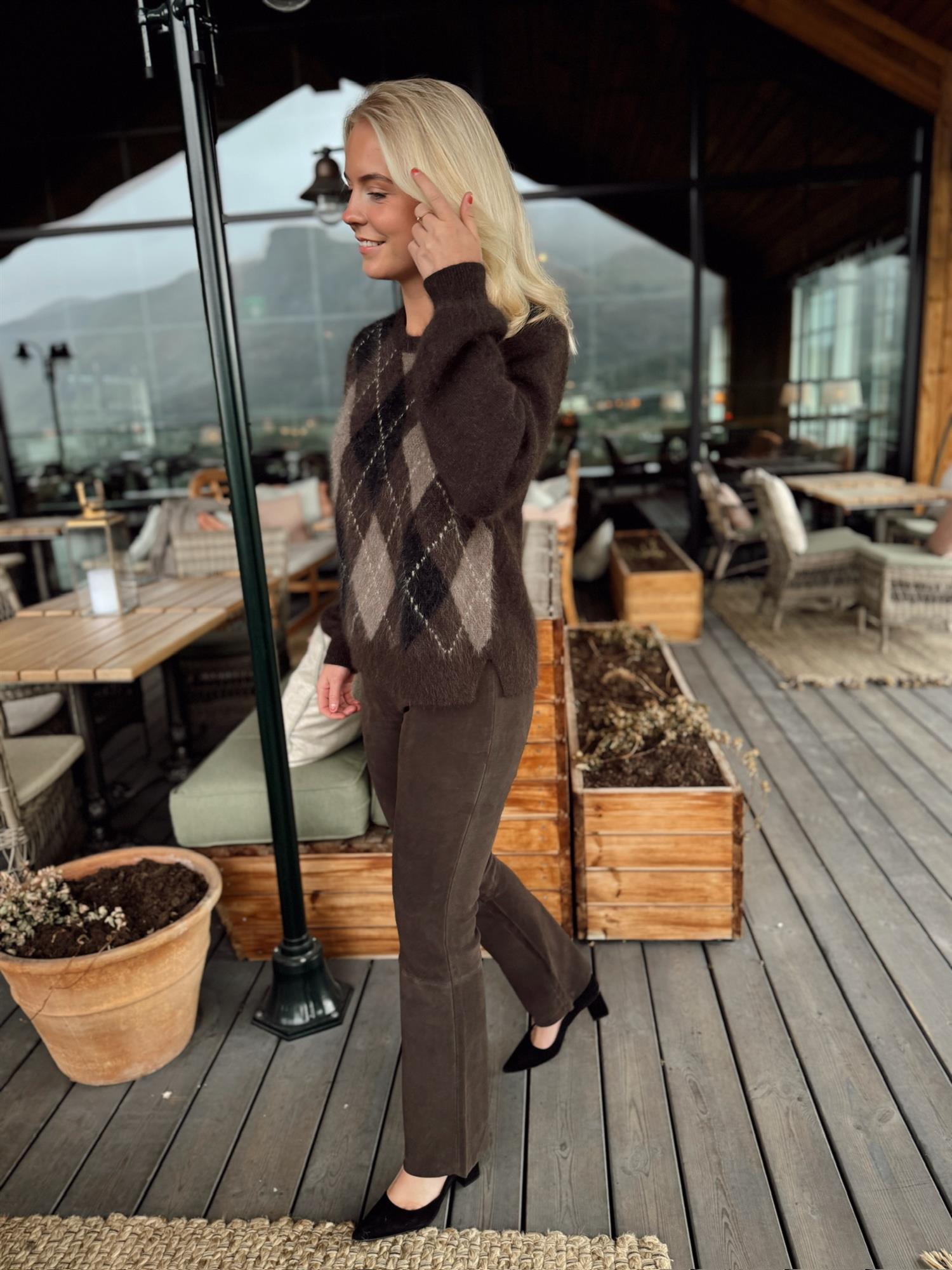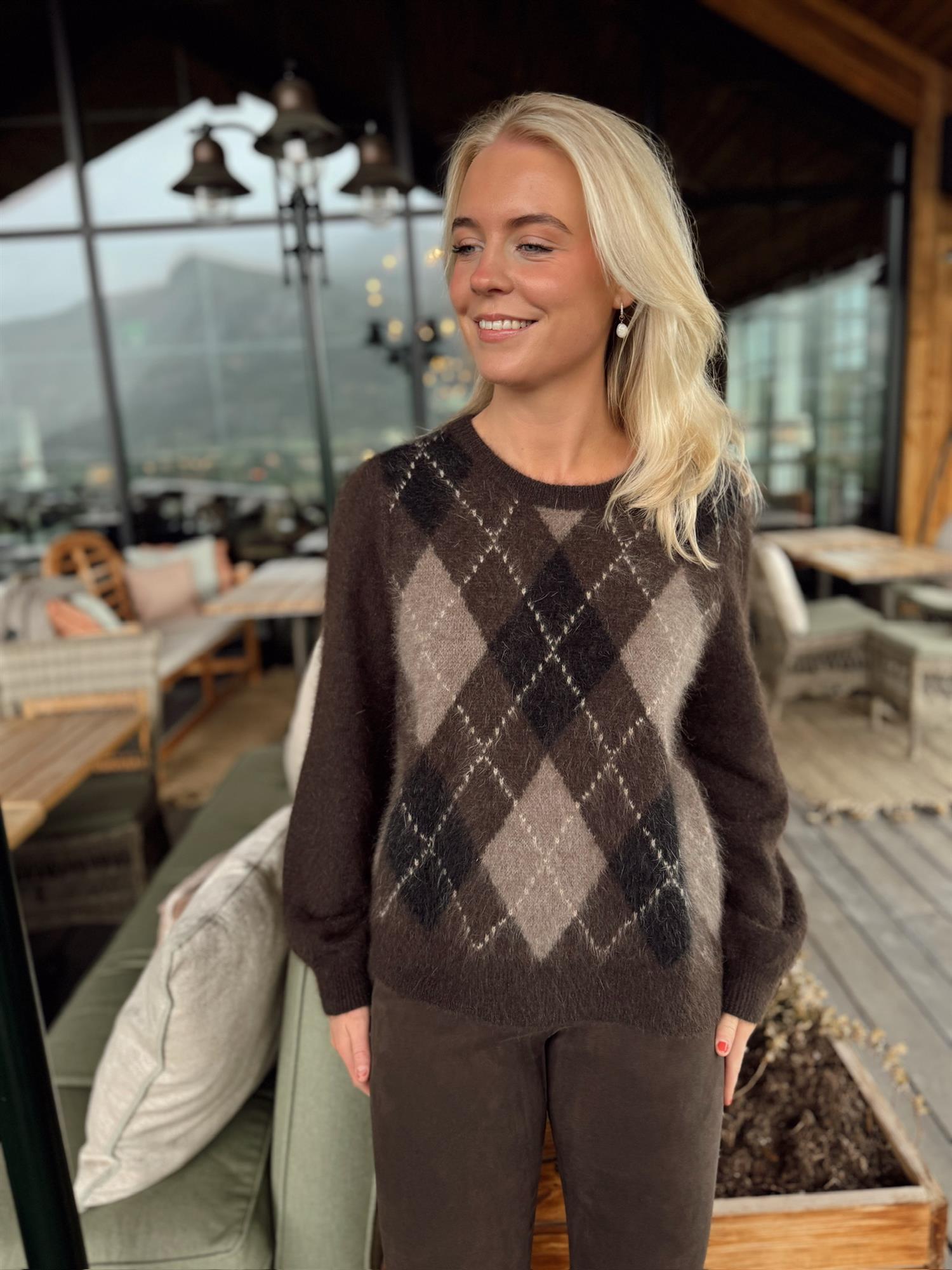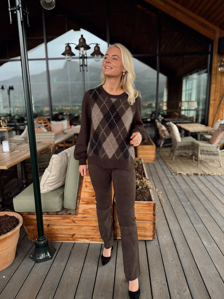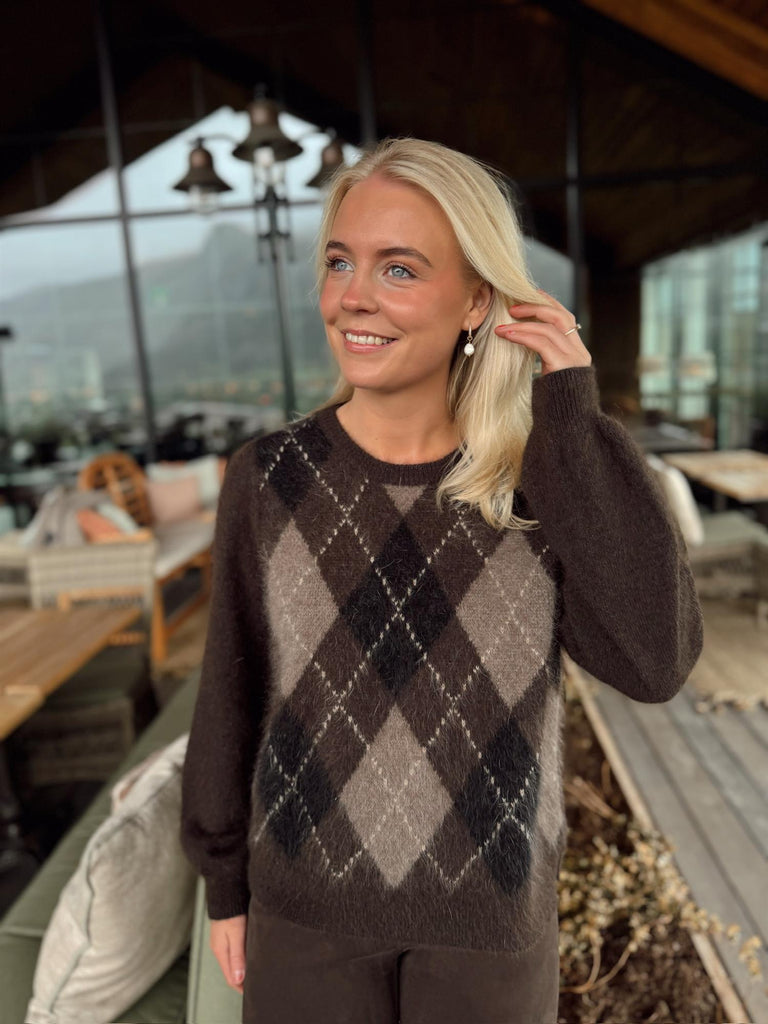 Argyle Pullover fra Ane Mone er en myk og lun genser i et tidløst rutemønster. Den klassiske argyle-strikken får en moderne oppdatering med harmoniske bruntoner, perfekt for høst og vinter.