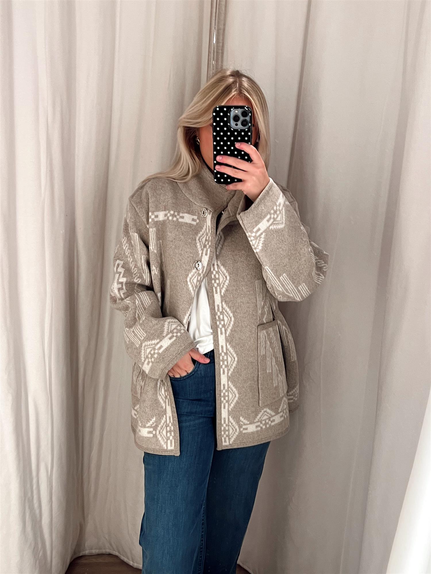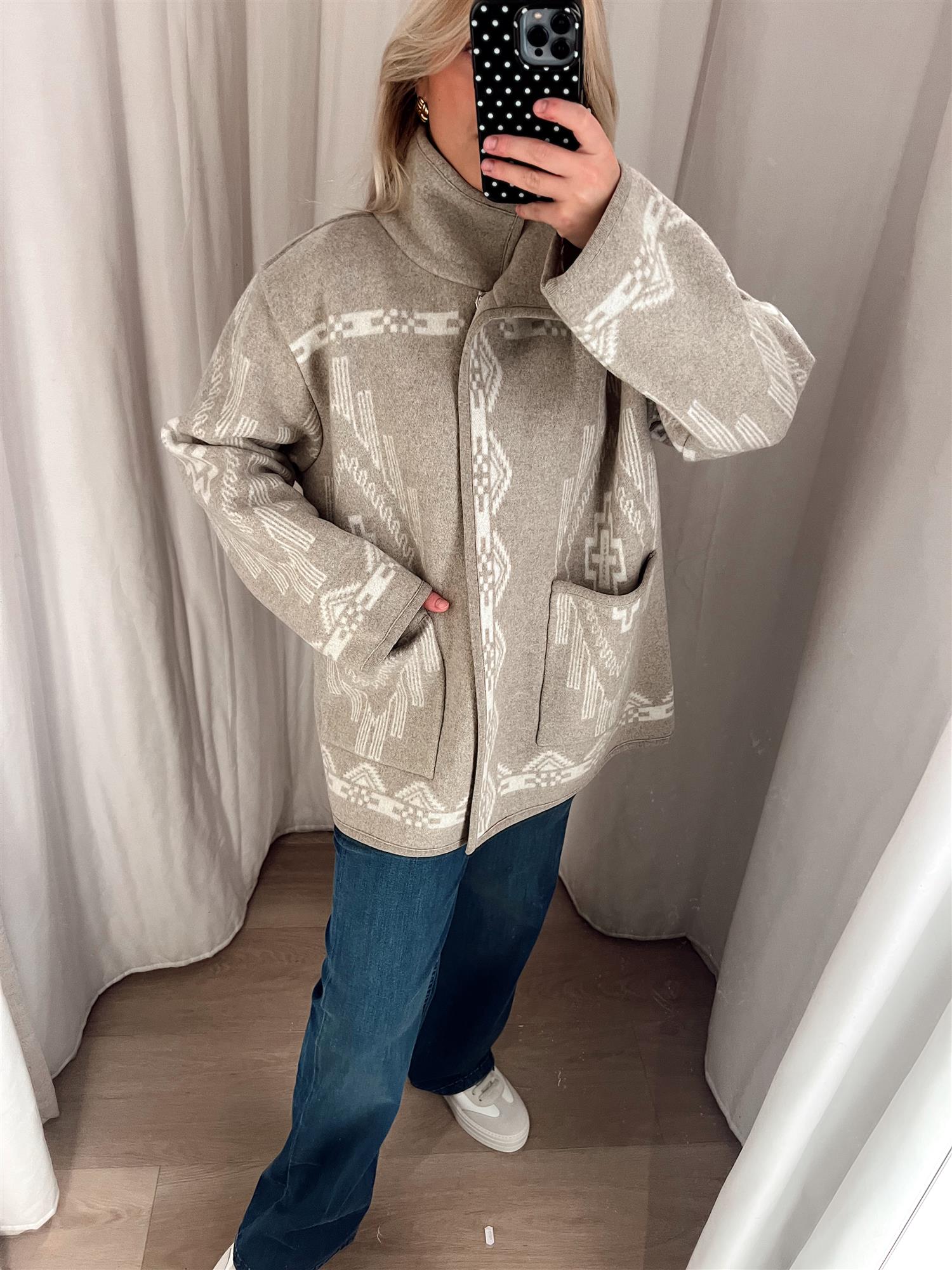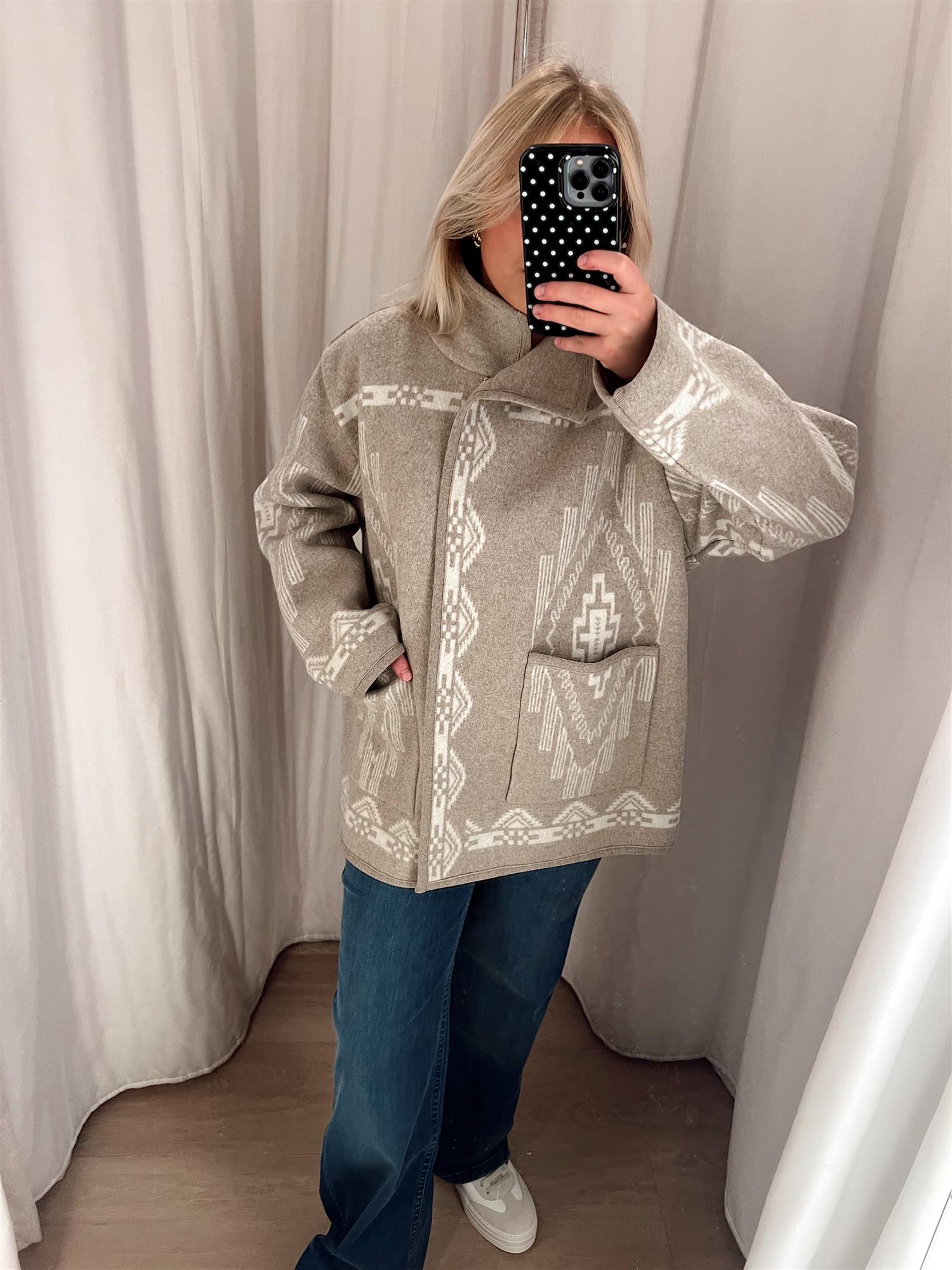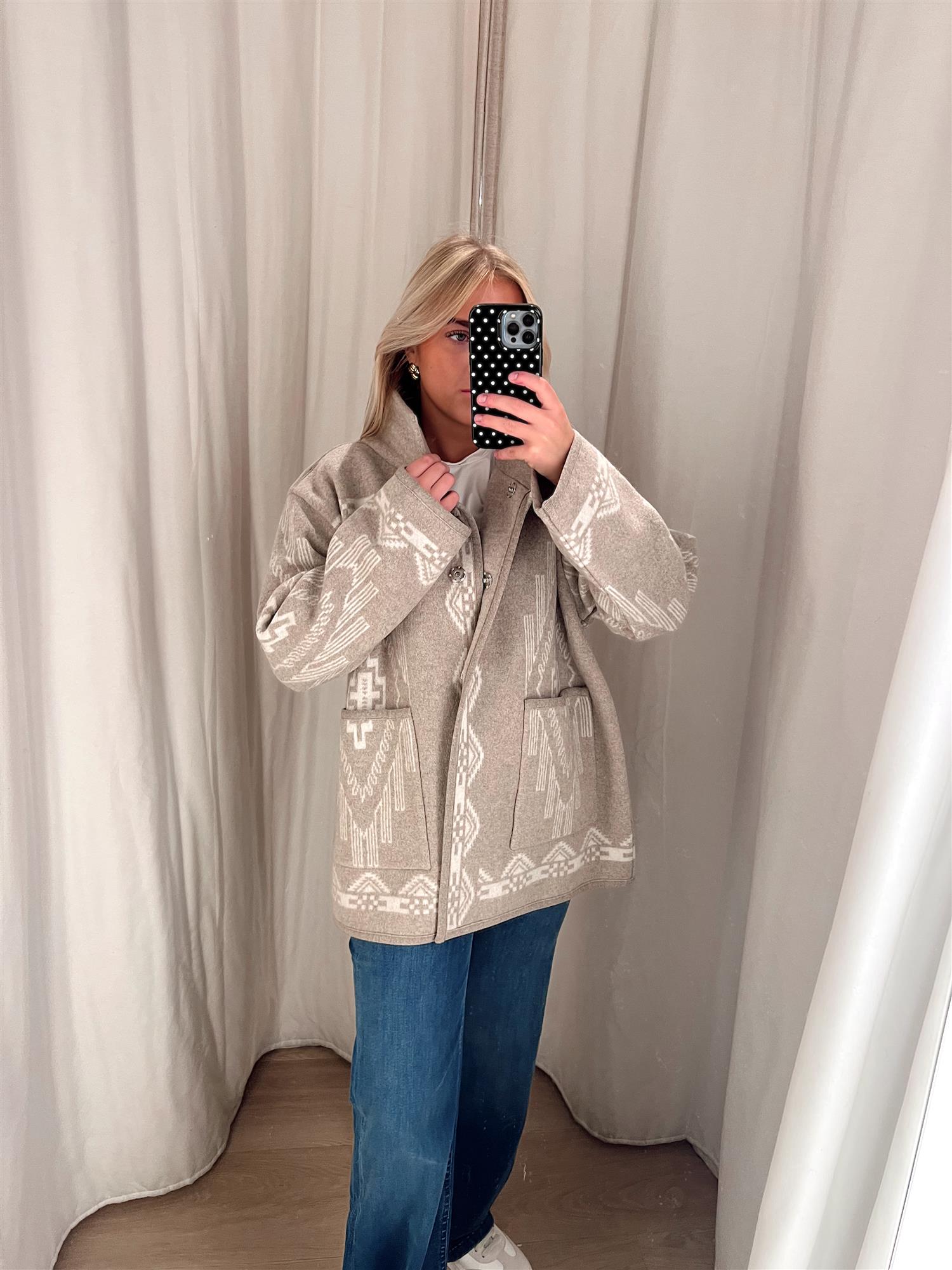 Jakken har en avslappet, oversized passform med tydelig inspirasjon fra 80-tallet. Den lukkes med trykkknapper i front og har romslige frontlommer som både er praktiske og gir ekstra komfort. En perfekt kombinasjon av tradisjonelt håndverk og moderne design.