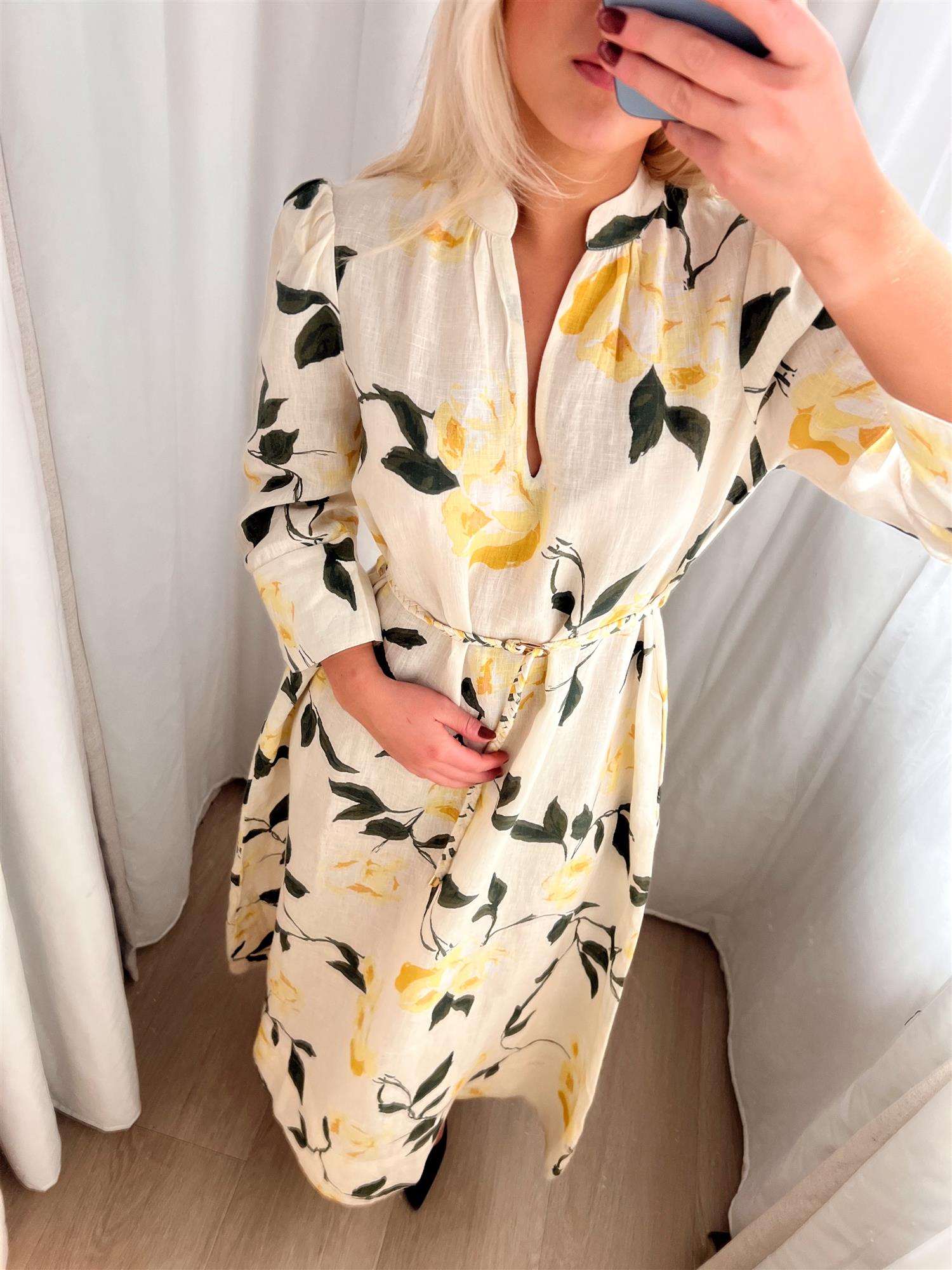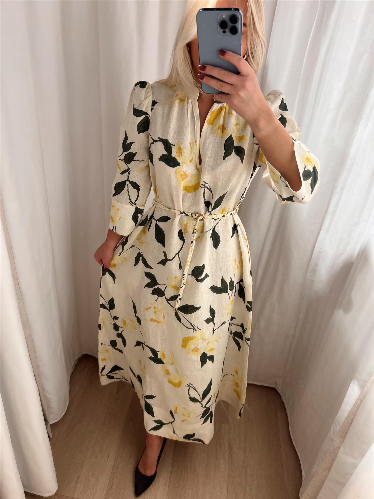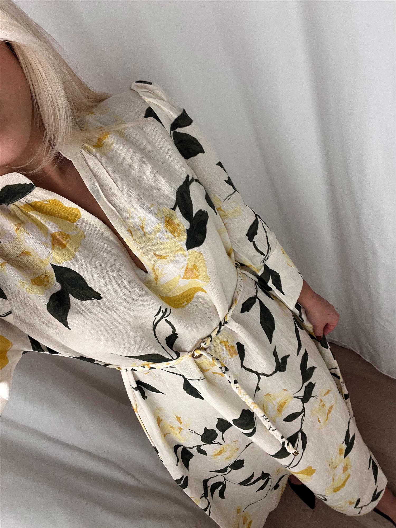 Den har en feminin V-utringning og trekvartlange ermer med brede, firkantede mansjetter som tilfører et sofistikert og moderne uttrykk. Det medfølgende flettede beltet markerer midjen og gir deg mulighet til å variere stylingen etter ønske.