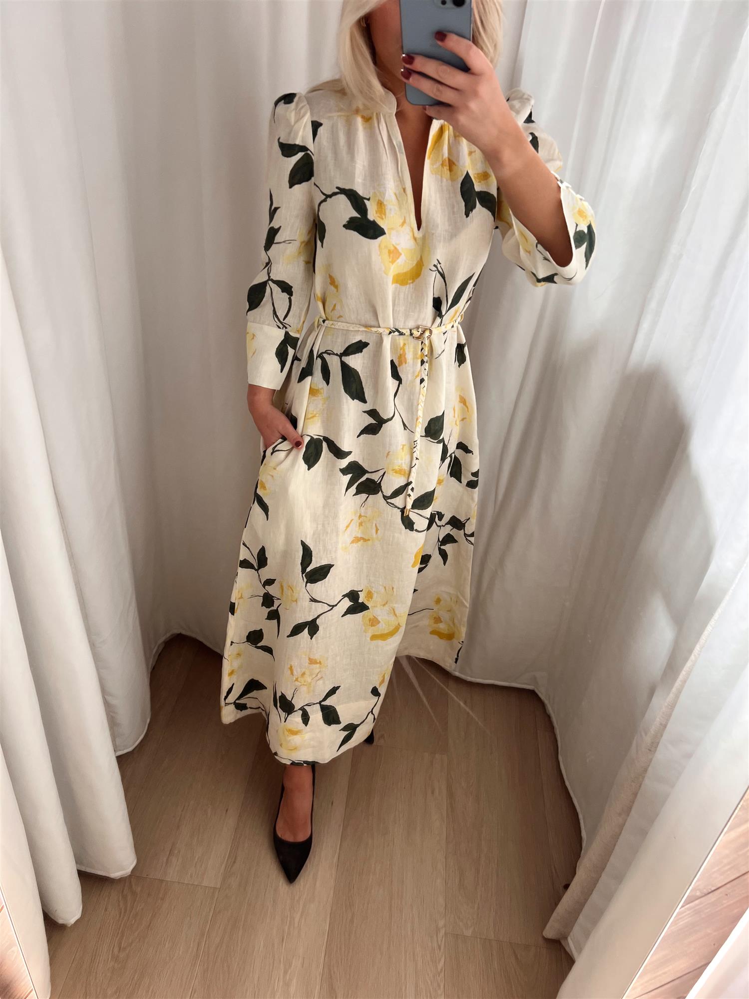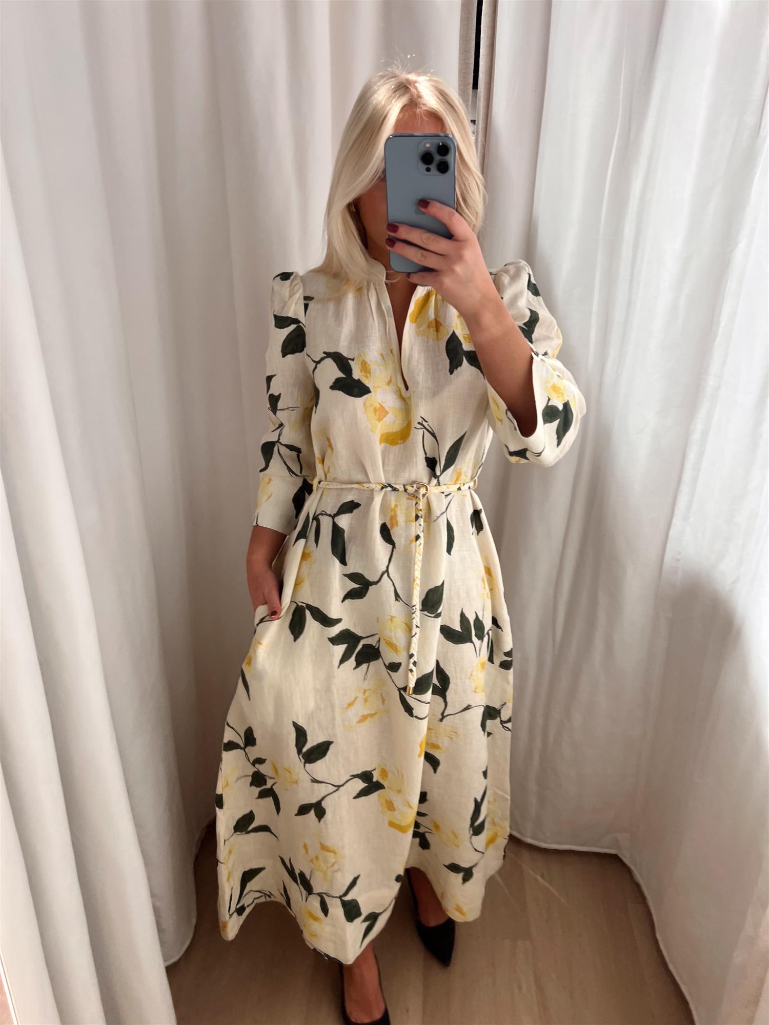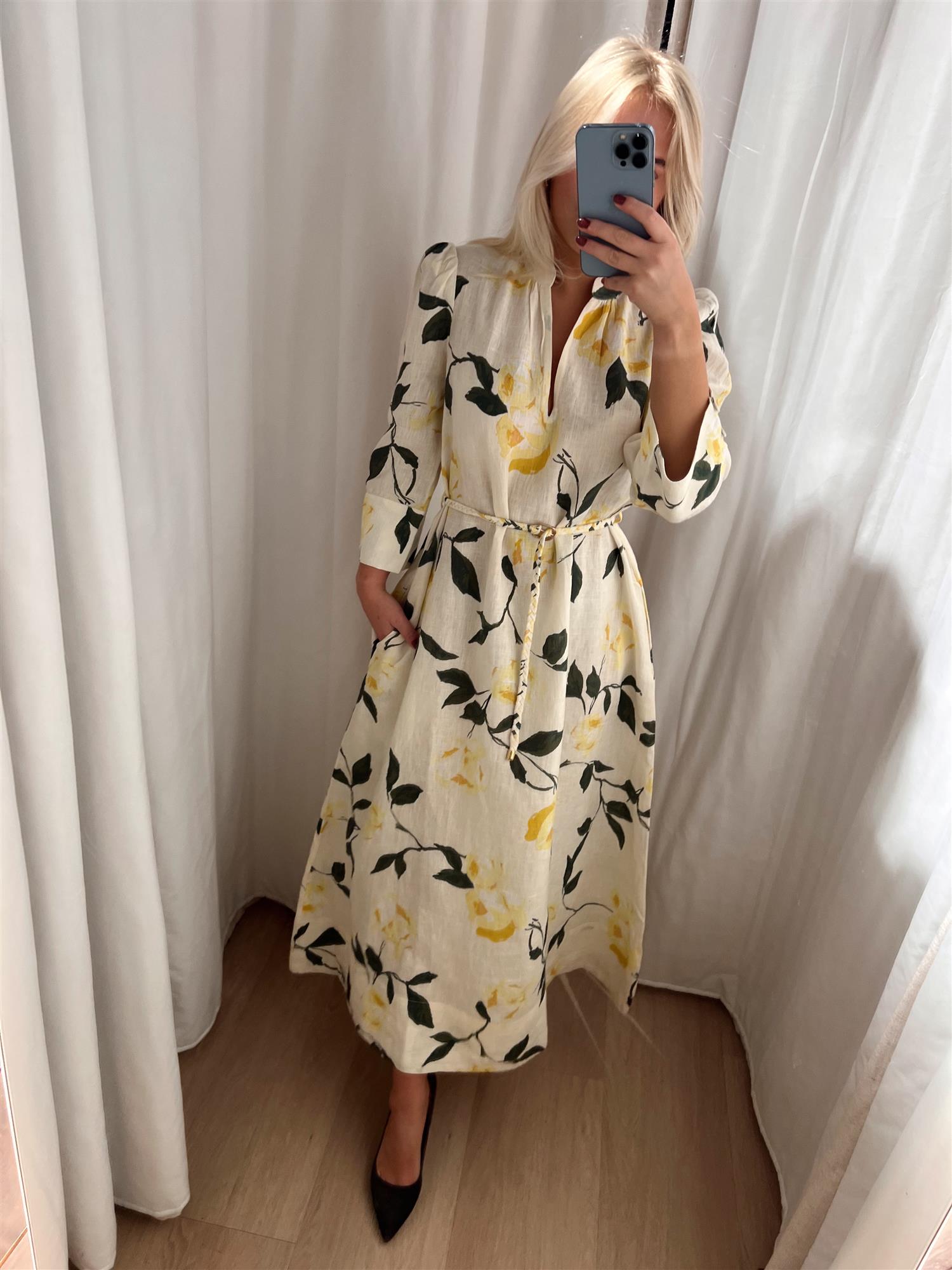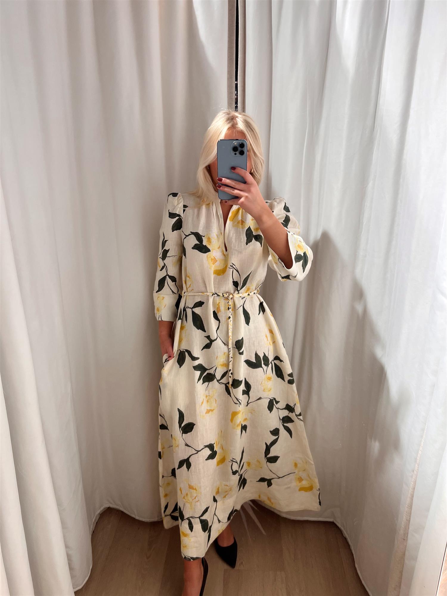 Den har en feminin V-utringning og trekvartlange ermer med brede, firkantede mansjetter som tilfører et sofistikert og moderne uttrykk. Det medfølgende flettede beltet markerer midjen og gir deg mulighet til å variere stylingen etter ønske.