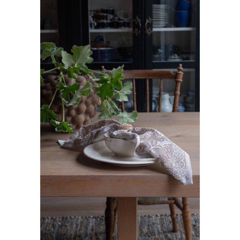 Serviett i 100 % bomull med et vakkert og detaljert mønster som gir borddekkingen et elegant uttrykk. Den dekorative kanten rundt servietten rammer inn designet og skaper et harmonisk og balansert helhetsinntrykk.