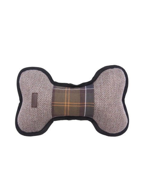 Hundeleke fra Barbour med det klassiske tartanmønster. Formet som et ben med pipelyd.